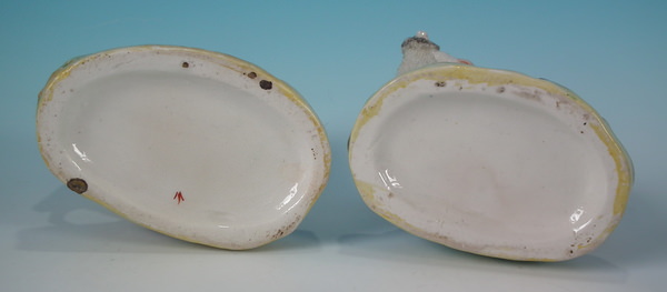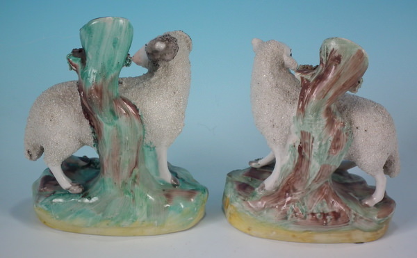 Pair of Staffordshire spill vases which feature a ram and a ewe, stood on a circular base.