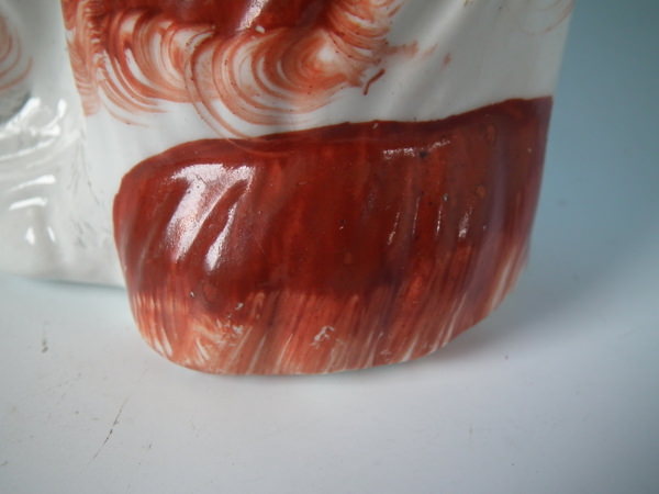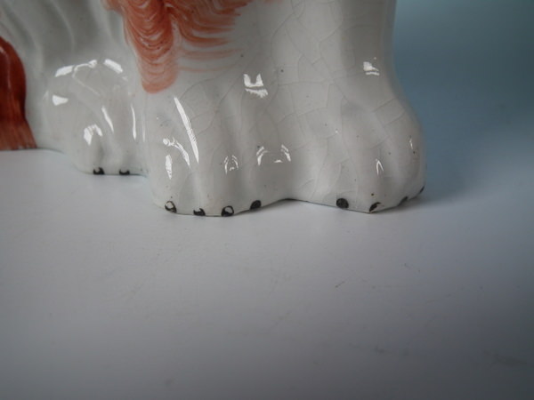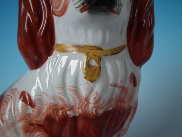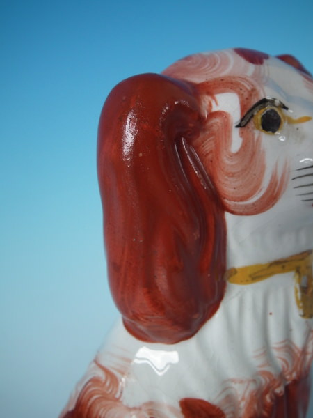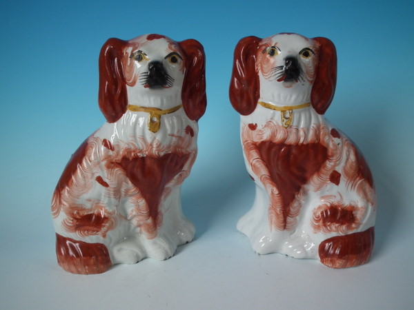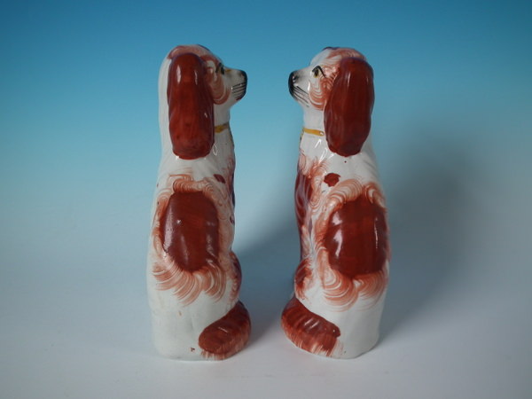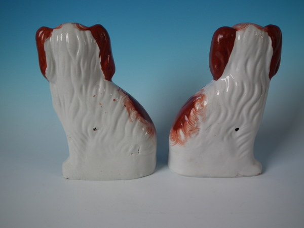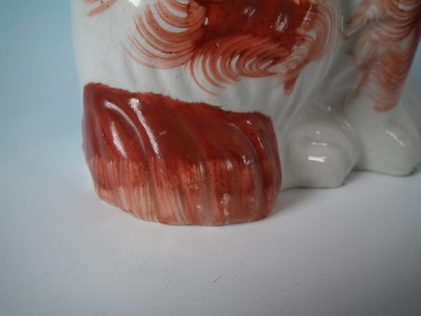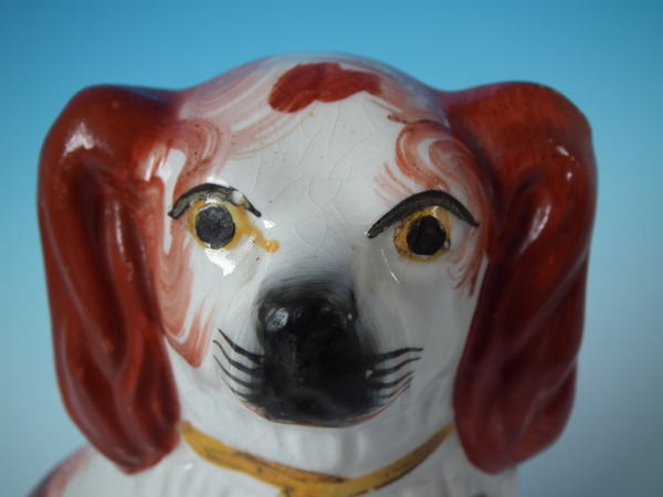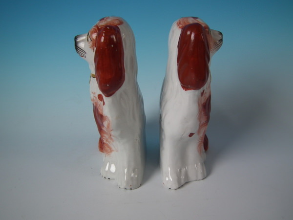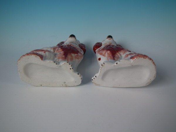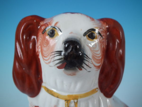 Victorian, circa 1860. Tallest is 7.5ins high, 5.1ins wide, 2.8ins depth. Pair of Staffordshire figures which feature a spaniel, seated directly on the ground, no base.