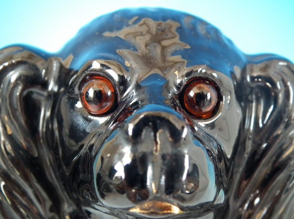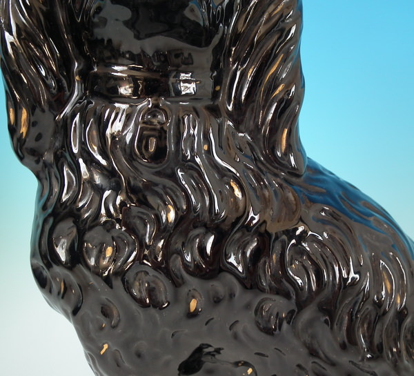 Victorian, circa 1890. 11.6ins high, 8.7ins wide, 5.9ins depth. Staffordshire figure which features a spaniel with glass eyes, seated directly on the ground, no base. Jackfield black version. Bright gilt embellishment. Decorated 'in the round' - decoration to front and reverse.