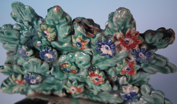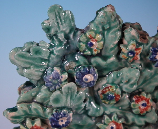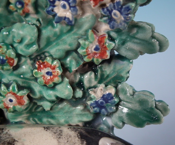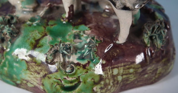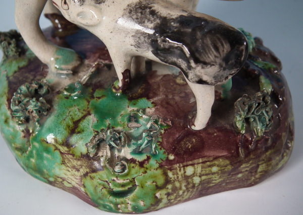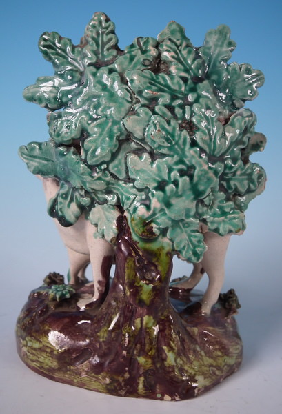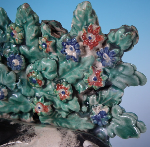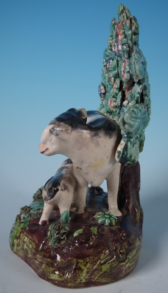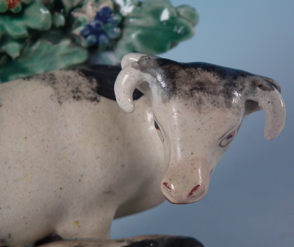 pre-Victorian, circa 1830. 4.7ins high, 3.5ins wide, 2.8ins depth. Staffordshire pearlware bocage figure with a pastoral theme which features a cow and calf, stood on a shaped base.