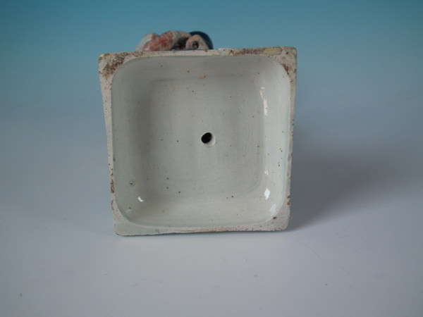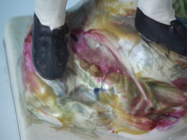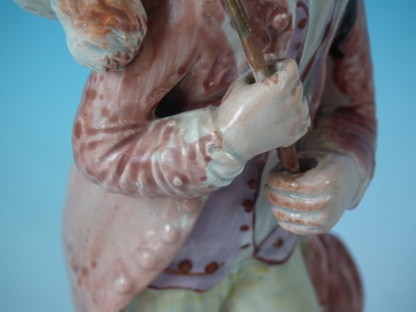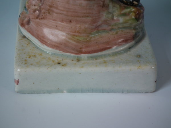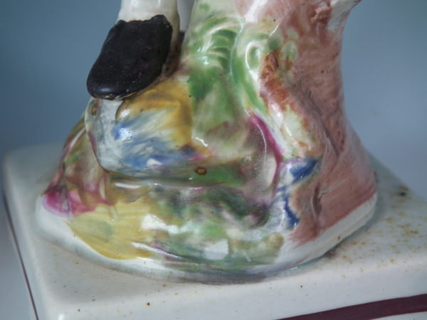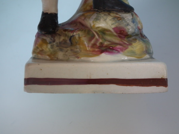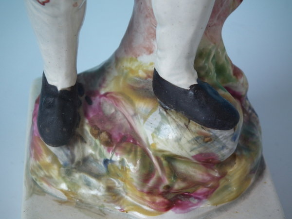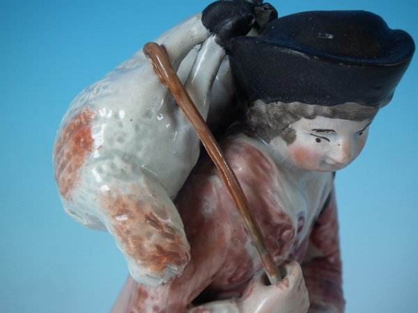 pre-Victorian, circa 1820. 8.7ins high, 3ins wide, 3ins depth. Staffordshire pearlware figure with a pastoral theme which features a shepherd carrying a sheep over his shoulder, stood on a square base. Multi-coloured version. Painted base line.