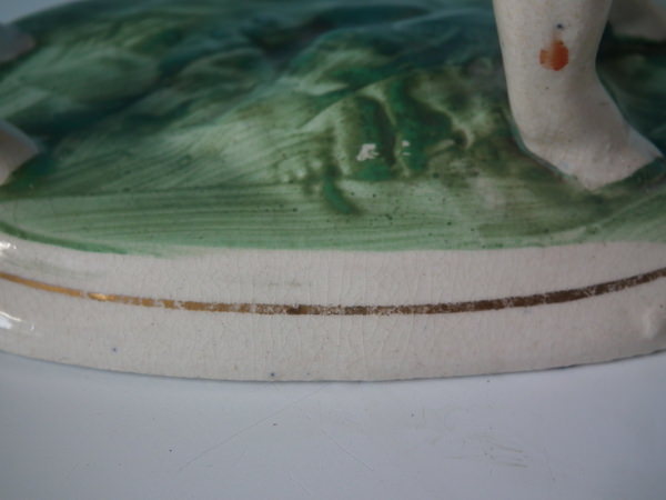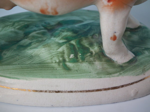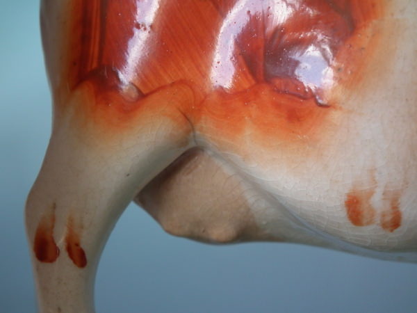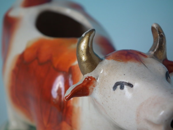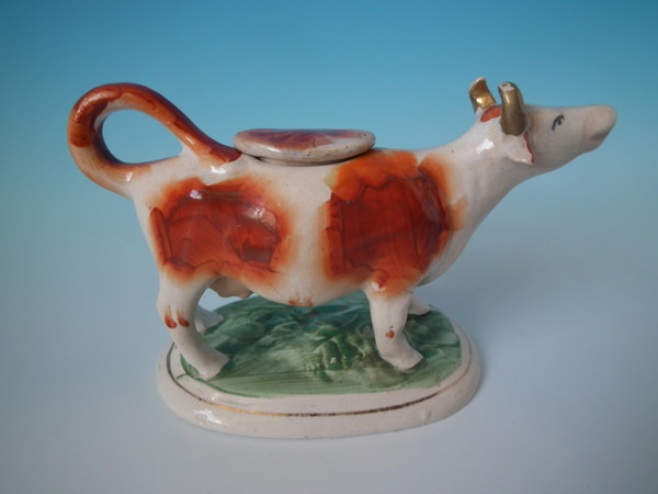 Victorian, circa 1900. 4.3ins high, 6.7ins wide, 3.3ins depth. Staffordshire cow creamer with a pastoral theme which features a cow, stood on an oval base. Russet and white version. Dull gilt base line and embellishment.