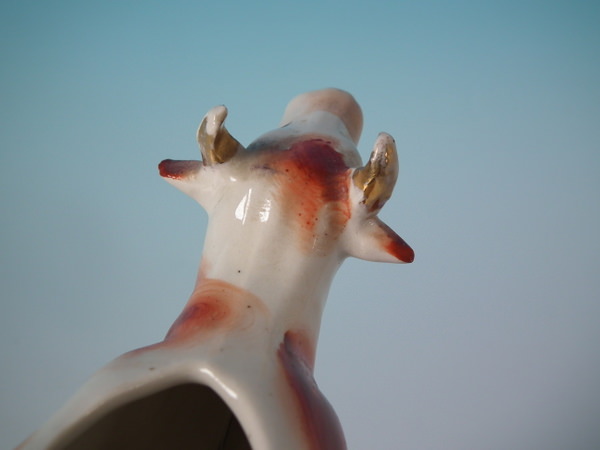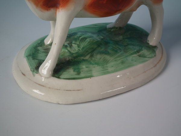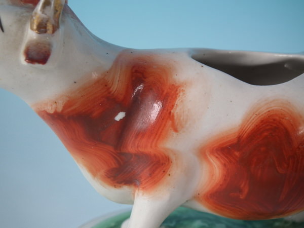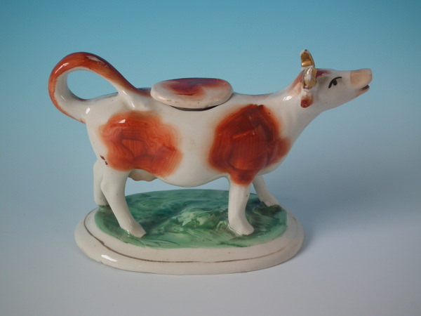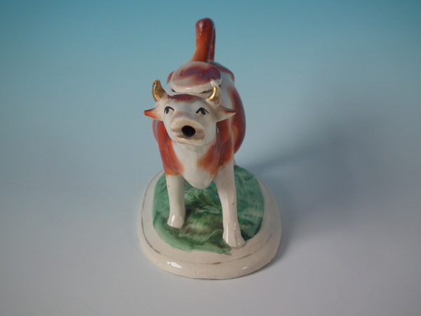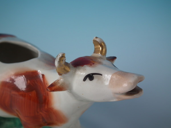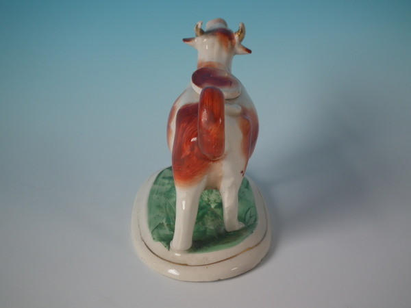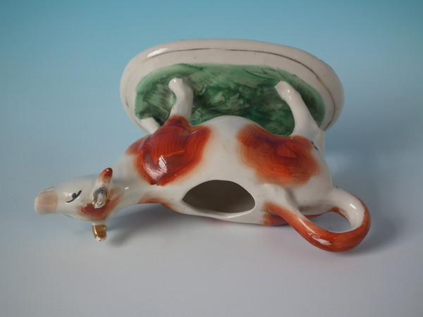 Edwardian, circa 1910. 4.3ins high, 6.7ins wide, 3.5ins depth. Staffordshire cow creamer with a pastoral theme which features a cow, stood on an oval base.
