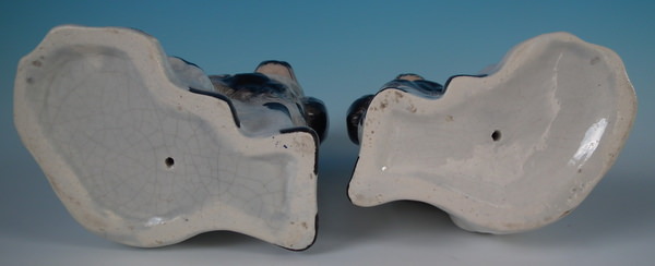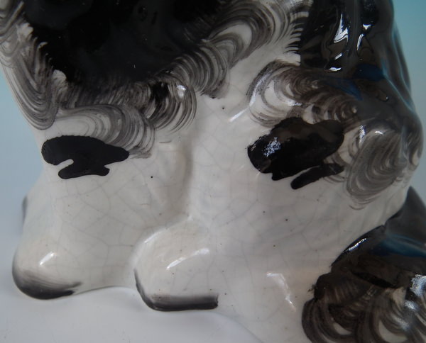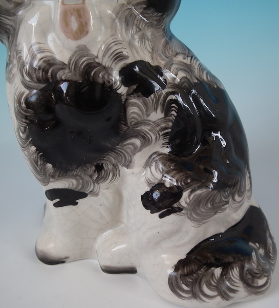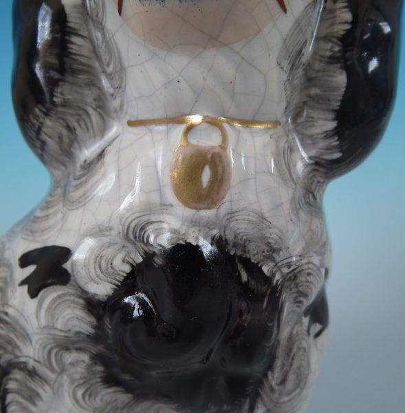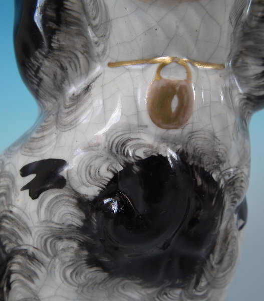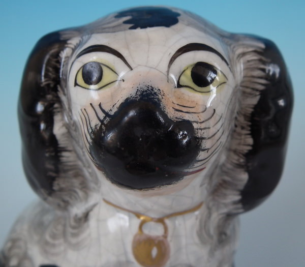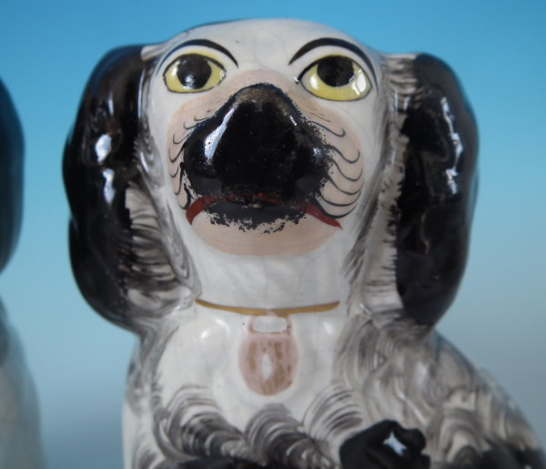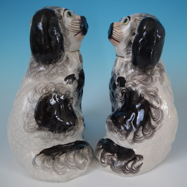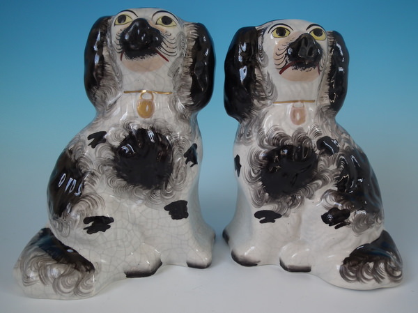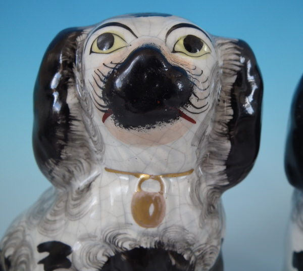Victorian, circa 1860. Tallest is 6.1ins high, 5.3ins wide, 3.5ins depth. Pair of Staffordshire figures which feature a spaniel, seated directly on the ground, no base. Black and white version. Dull gilt collar and locket.