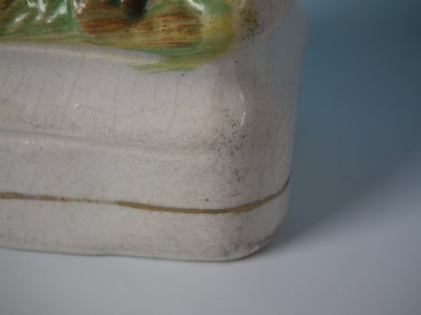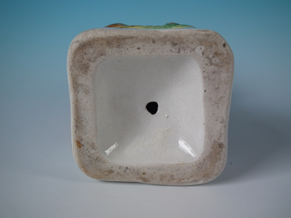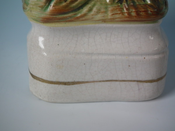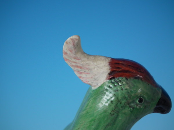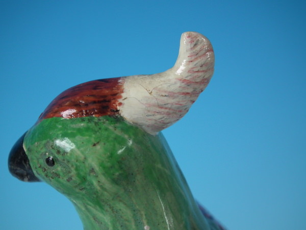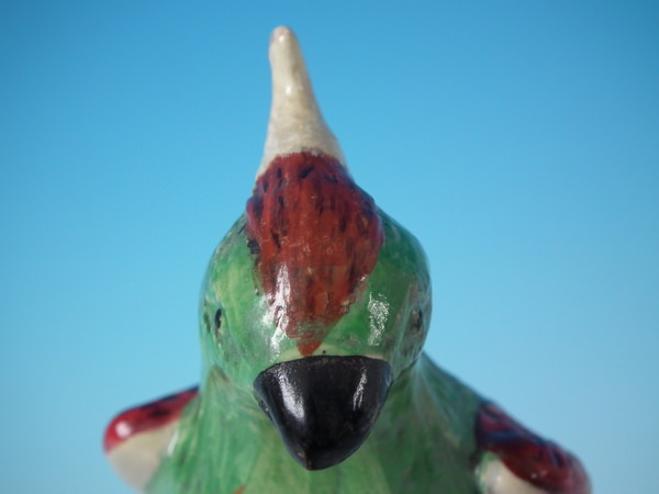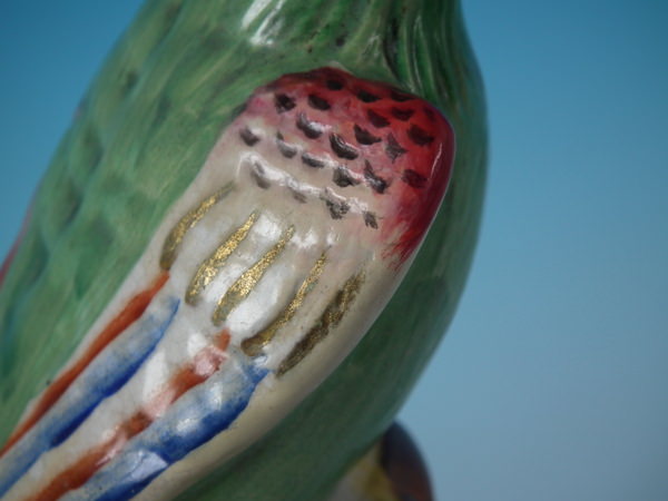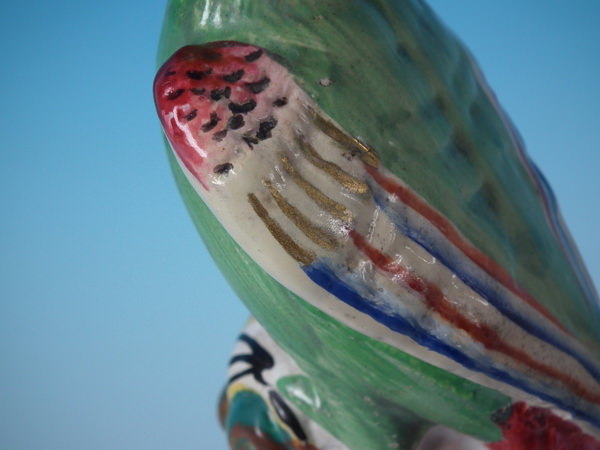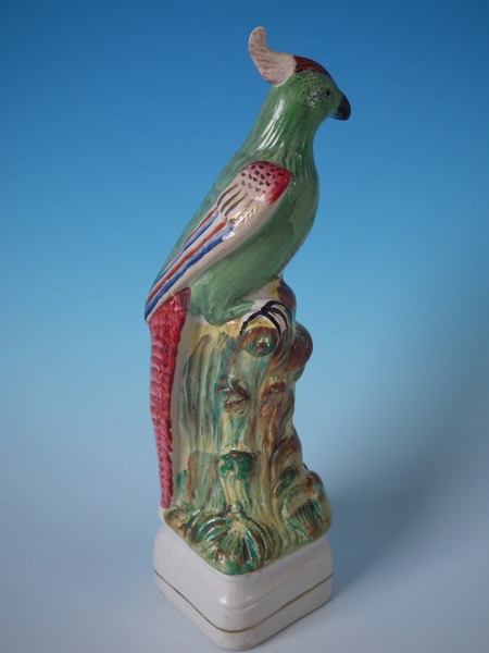 Victorian, circa 1860. 9.8ins high, 2.8ins wide, 2.8ins depth. Staffordshire figure which features a parrot, perched on a square base. Dull gilt base line.