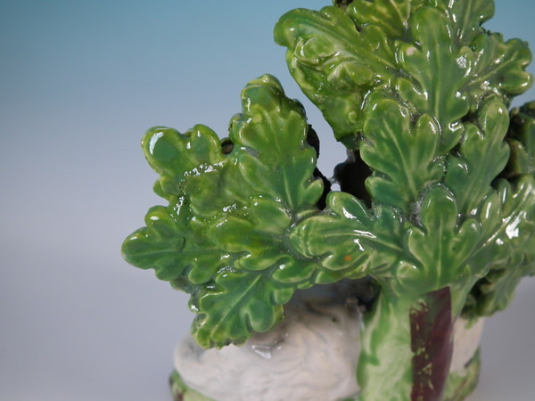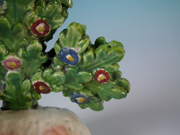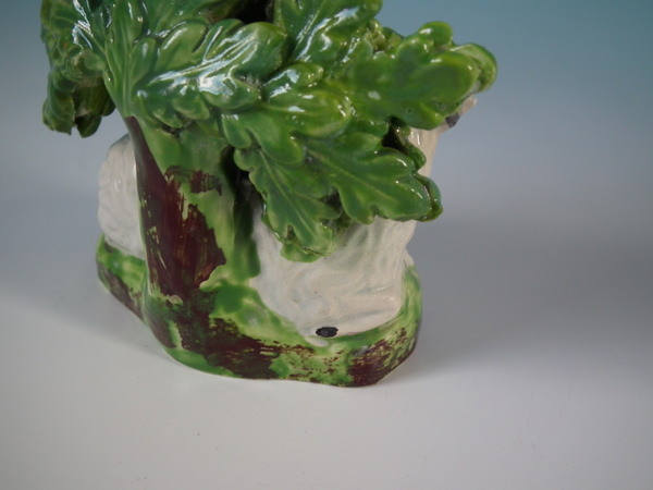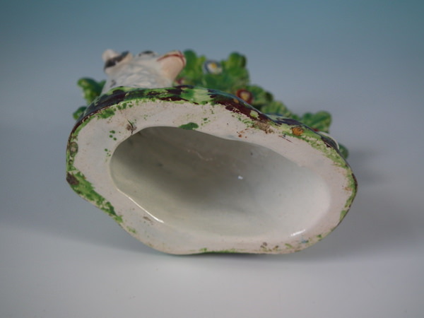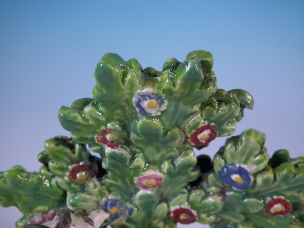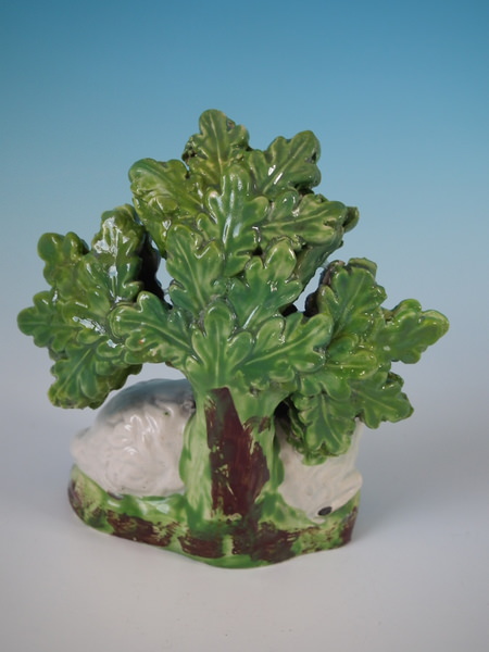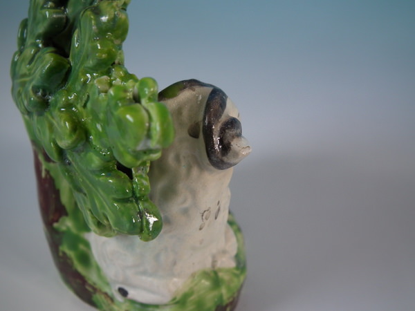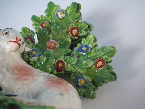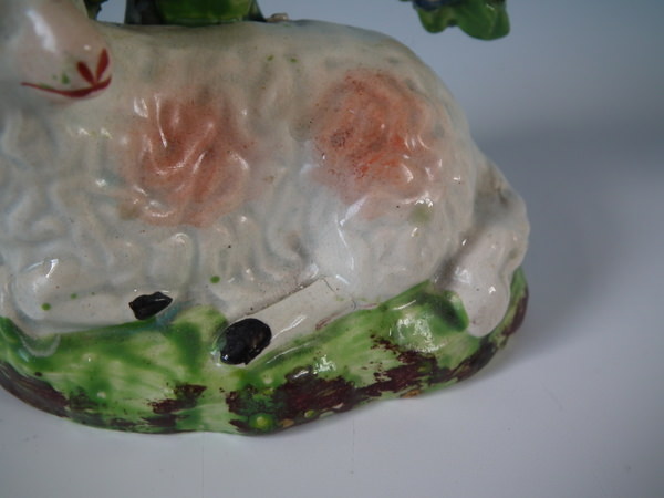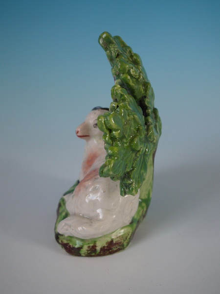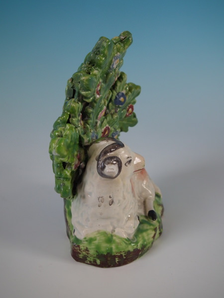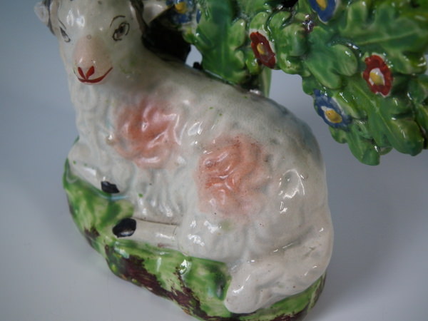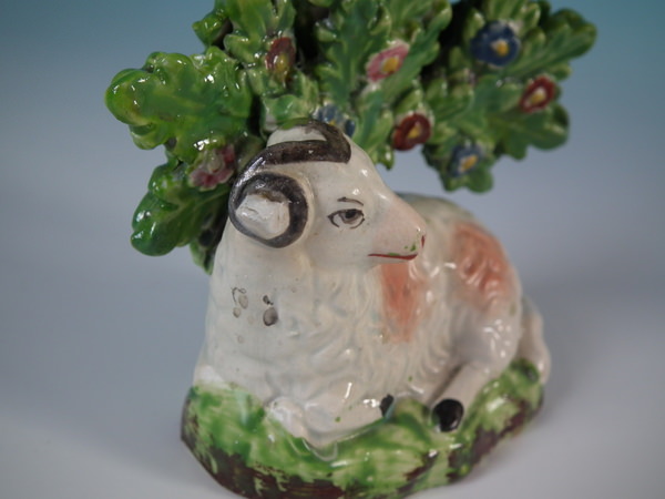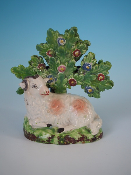 pre-Victorian, circa 1830. 3.9ins high, 3.5ins wide, 2ins depth. Staffordshire pearlware bocage figure which features a ram in front of a flowering tree,