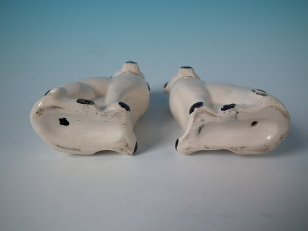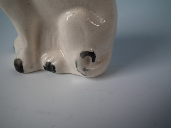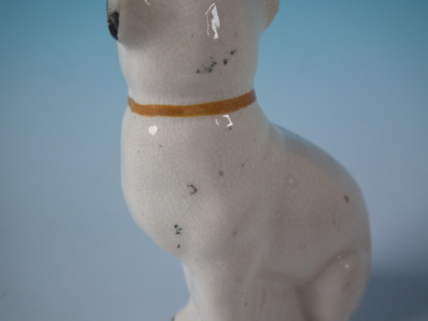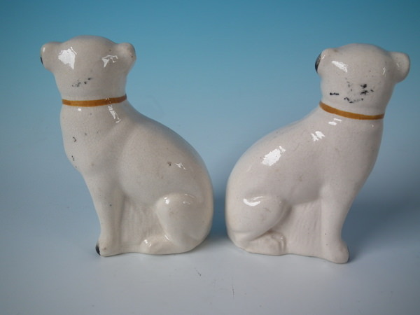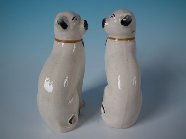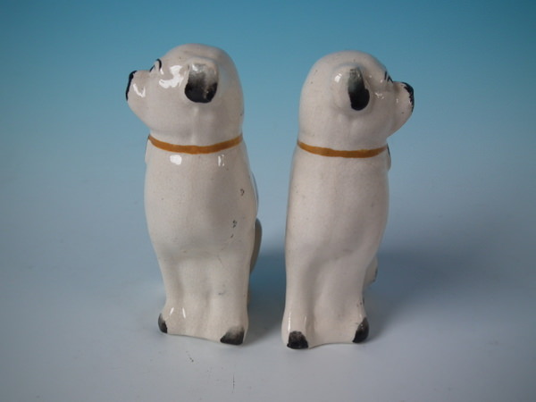 Victorian, circa 1900. Tallest is 3.9ins high, 2.4ins wide, 1.4ins depth. Pair of Staffordshire figures which feature a pug, seated directly on the ground, no base.