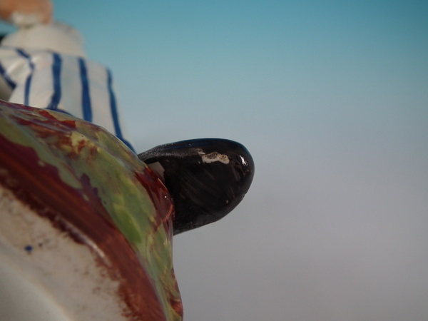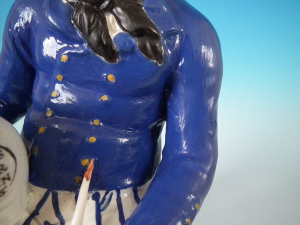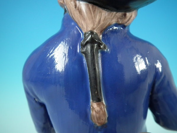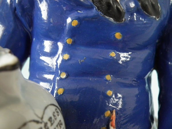 RESTORATION: Retouched paint losses and flakes to his jacket, buttons, trousers, shoes, hat, hair and ground.
