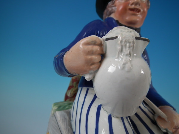 pre-Victorian, circa 1820. 9.7ins high, 4.9ins wide, 6.3ins depth. Staffordshire jug/pitcher with a maritime theme which features a sailor holding a pipe in one hand and an overflowing mug of ale in the other.