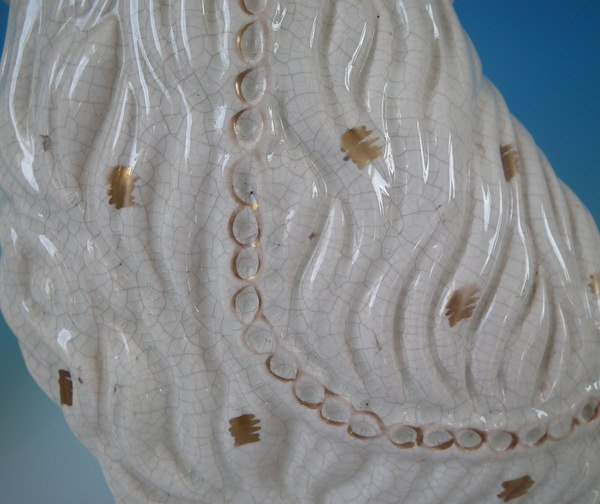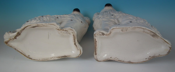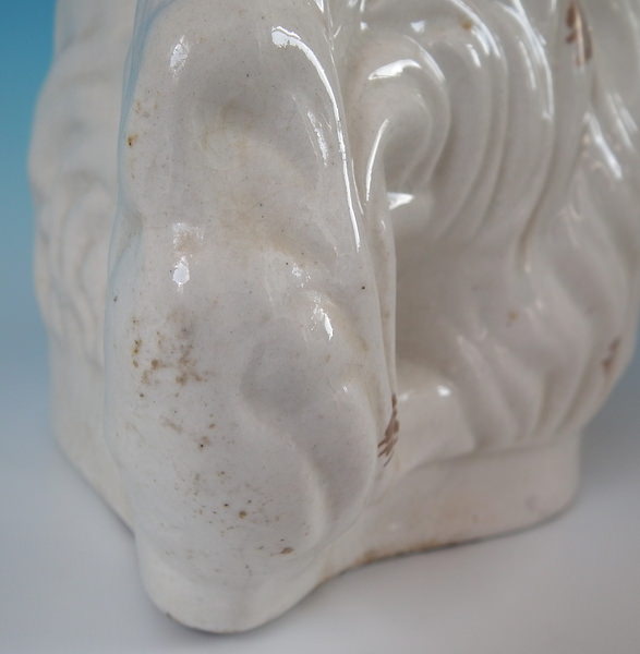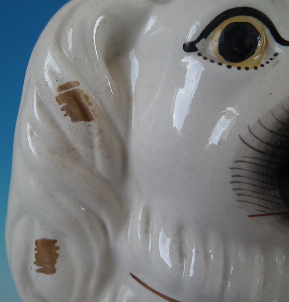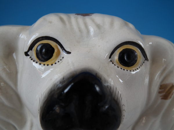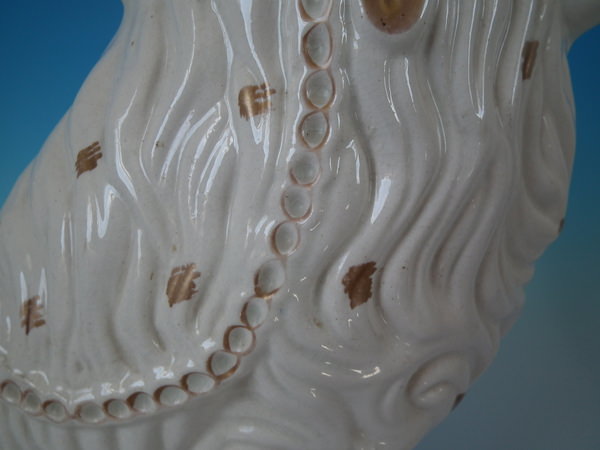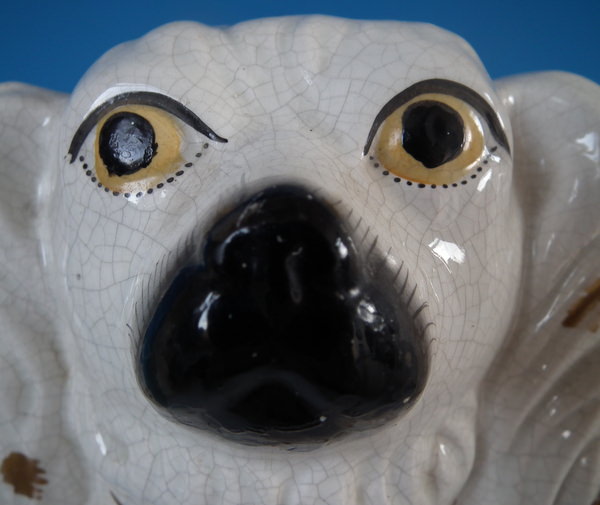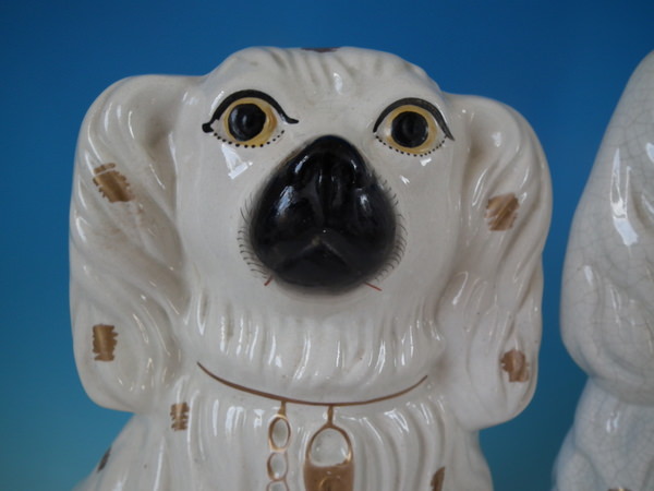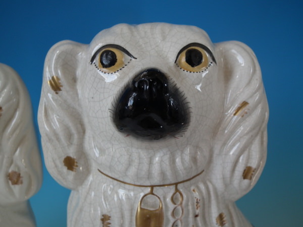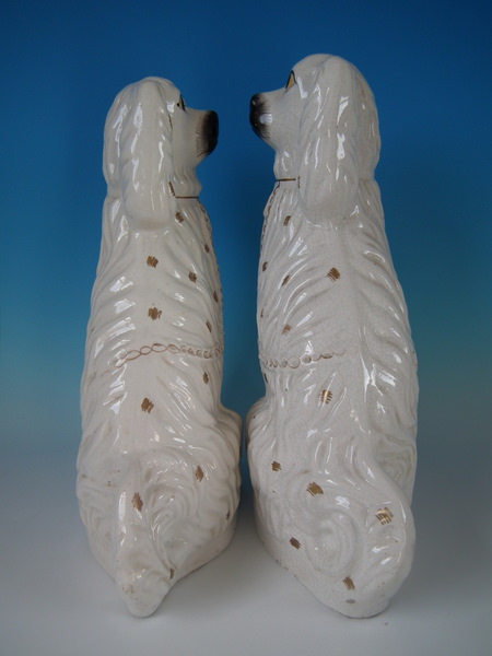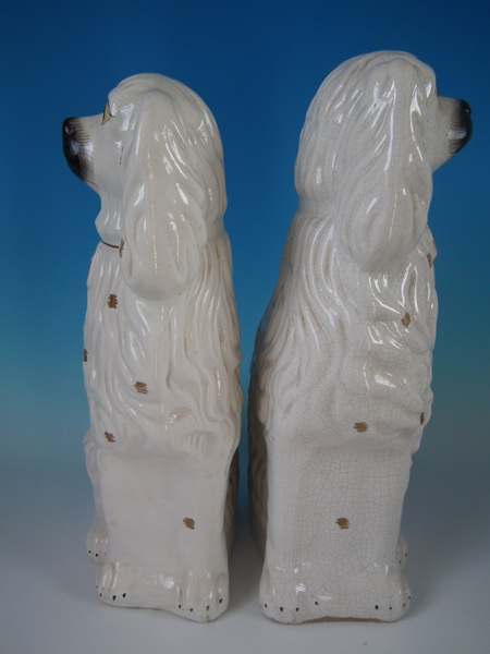 Victorian, circa 1860. Tallest is 15.6ins high, 10.2ins wide, 5.1ins depth. Pair of Staffordshire figures which feature a spaniel, seated directly on the ground, no base. We think they have possibly been matched up together at some stage because they have significantly different crazing. White and gilt version. Dull gilt collar and locket.