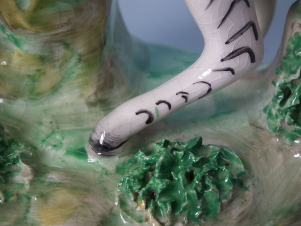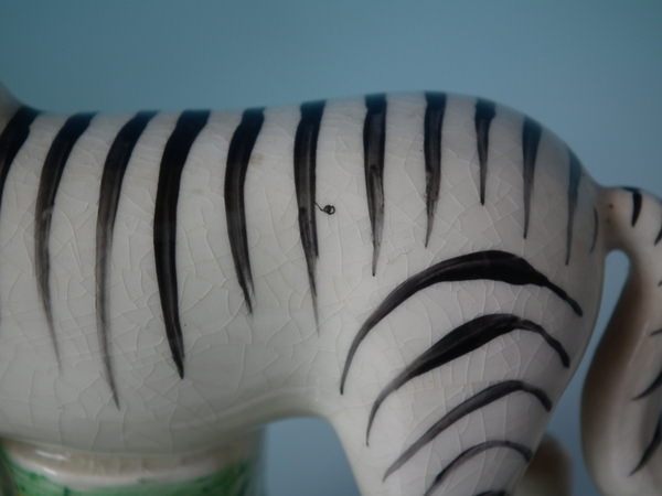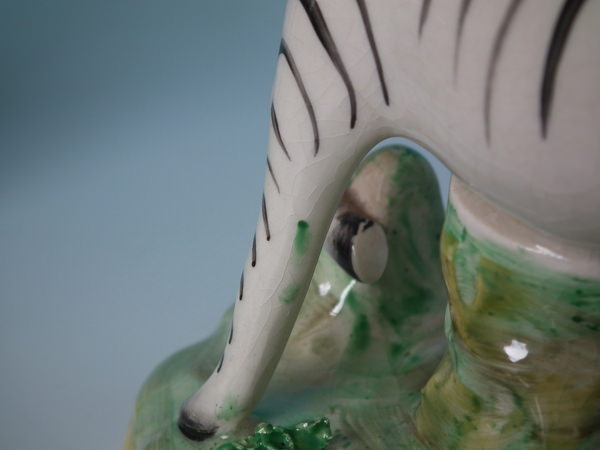 KILN EFFECT: flecks of stray coloured glaze to the zebra's front left leg.