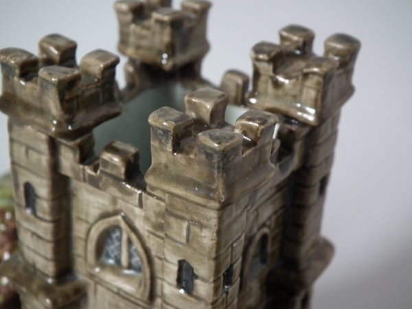 pre-Victorian, circa 1820. 5.1ins high, 7.1ins wide, 4.5ins depth. Staffordshire pearlware castle which features turreted castle tower, stood on a shaped base.