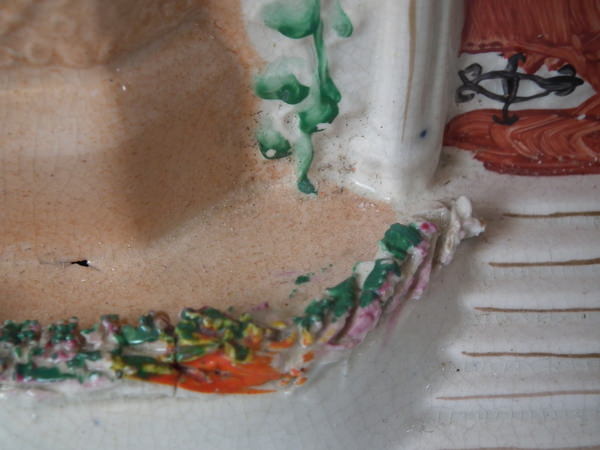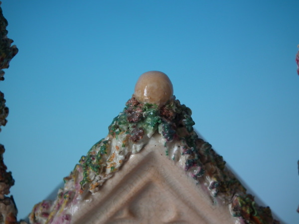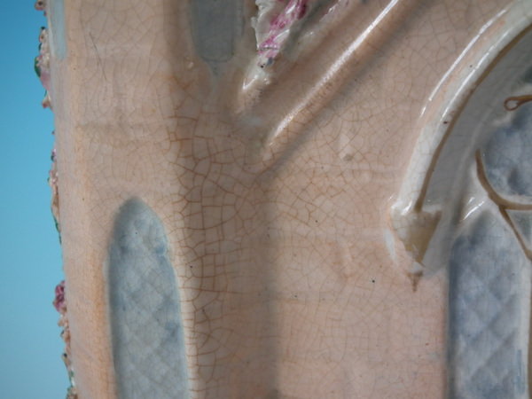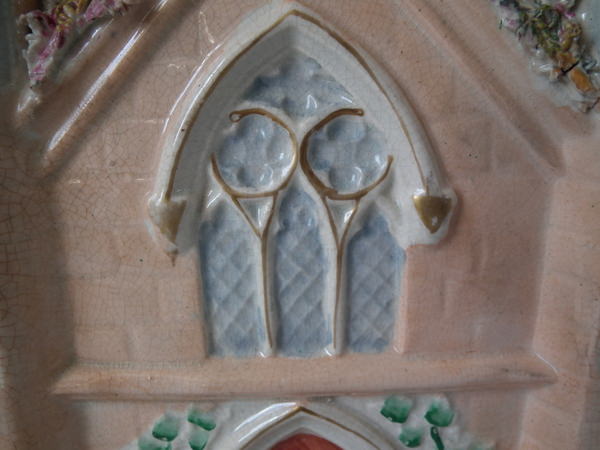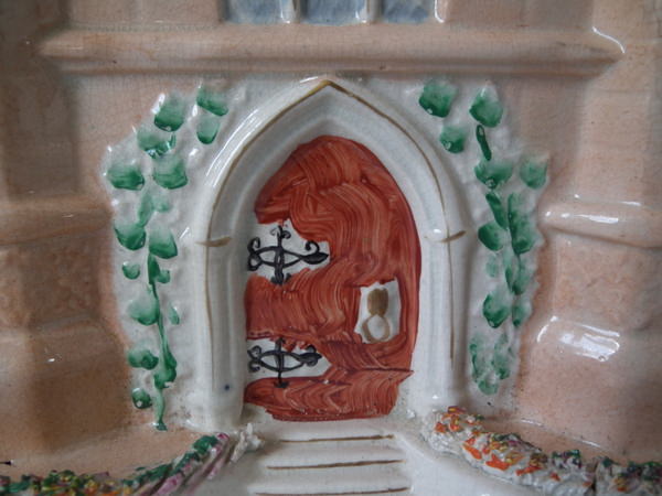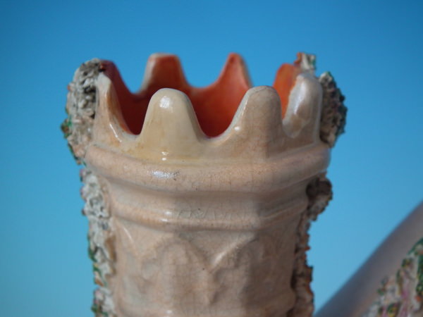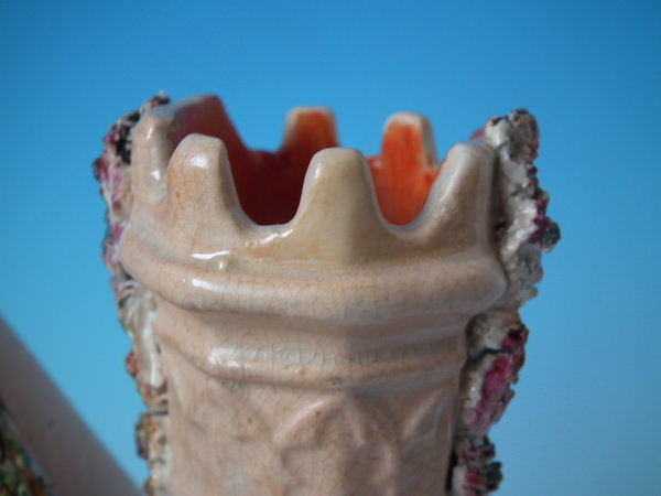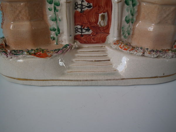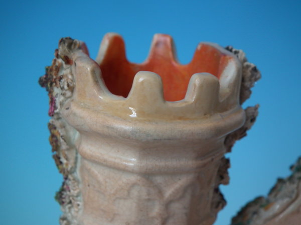 Victorian, circa 1860. 8.6ins high, 6.9ins wide, 3.3ins depth. Staffordshire spill vase which features a castle/chapel with twin turrets, stood on a rectangular base. Multi-coloured version. Dull gilt base line and embellishment.