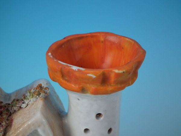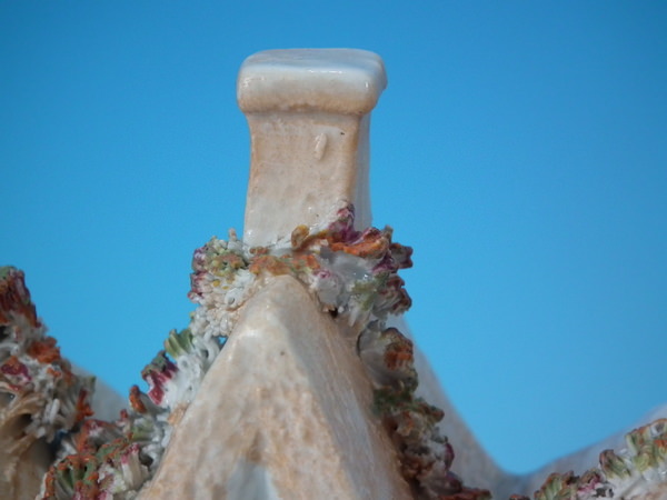 KILN EFFECTS: a piece of kiln detritus caught in the glaze to the chimney;