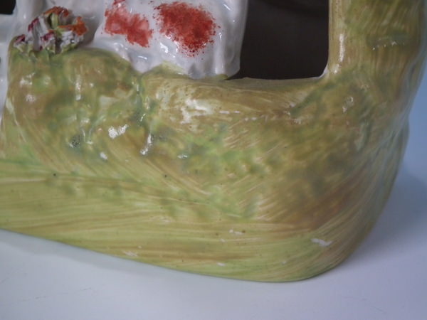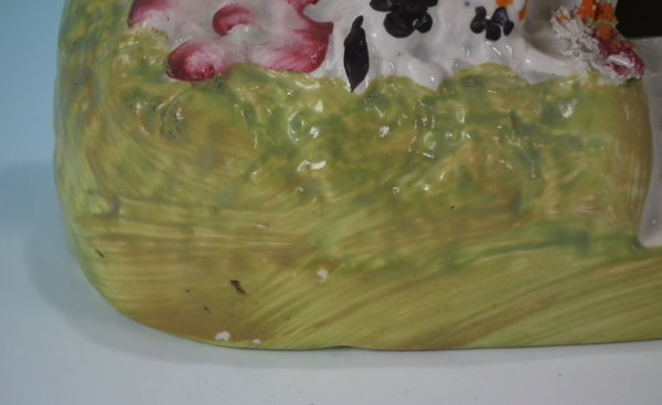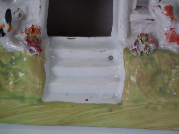 Staffordshire house which features a clock face, cat, dog and sheep, resting on a rectangular base.