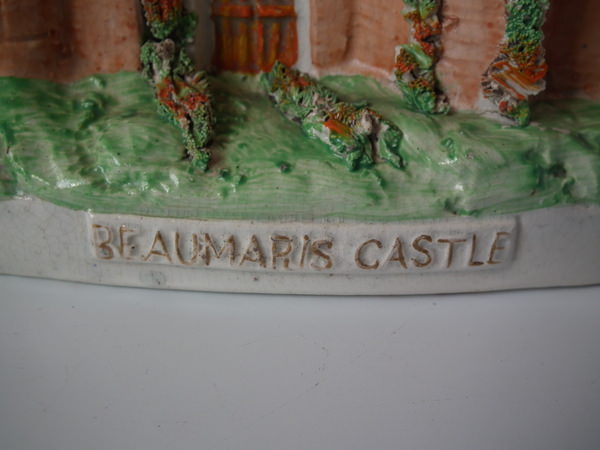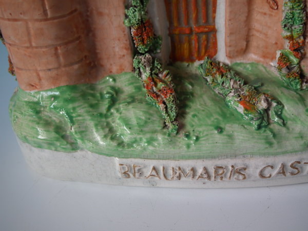 Victorian, circa 1860. 6.1ins high, 7.9ins wide, 2.7ins depth. Staffordshire spill vase which features three towers and a central gate, stood on an oblong base. The piece is titled, ''BEAUMARIS CASTLE'' . Multi-coloured version. Dull gilt titles and embellishment. Flatback, decorated only to the front. This piece represents Beaumaris Castle, which is a castle on the island of Anglesey, North Wales.