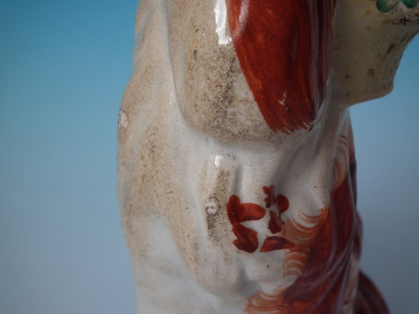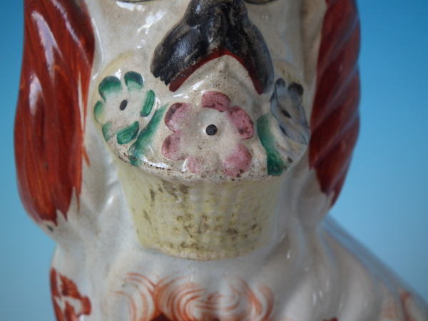Victorian, circa 1860. 8.3ins high, 4.7ins wide, 3.9ins depth. Staffordshire figure which features a spaniel holding a basket of flowers in it's mouth, seated directly on the ground, no base. Russet and white version.