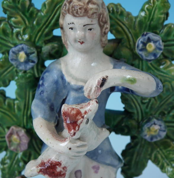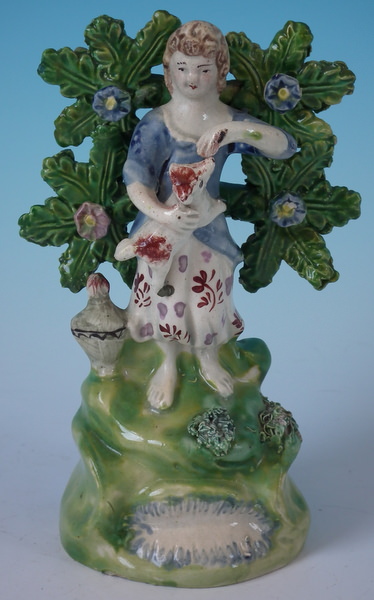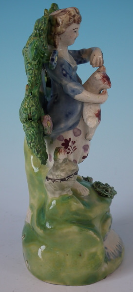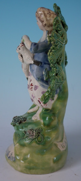 pre-Victorian, circa 1820. 5.5ins high, 3.3ins wide, 2.2ins depth. Walton Staffordshire pearlware bocage figure with a pastoral theme which features a girl playing with a lamb, stood on a shaped base. Multi-coloured version.