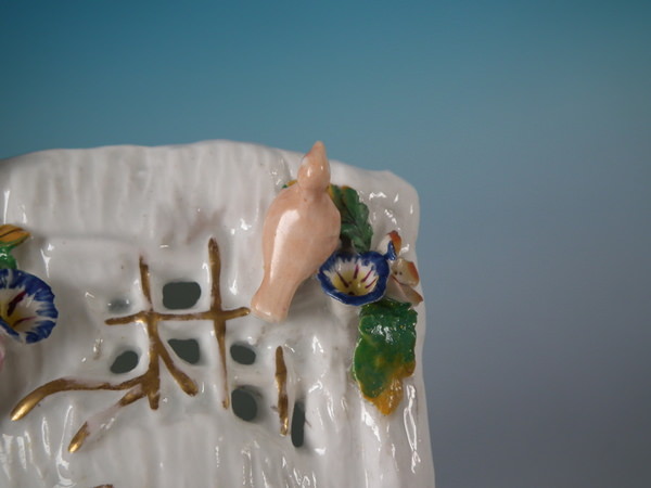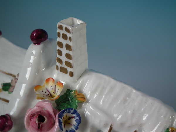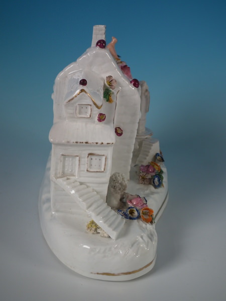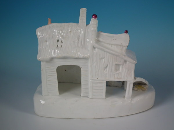 Victorian, circa 1860. 7.1ins high, 8.7ins wide, 5.1ins depth. Staffordshire pastille burner which features a cottage with a bird on the roof,