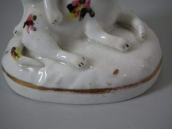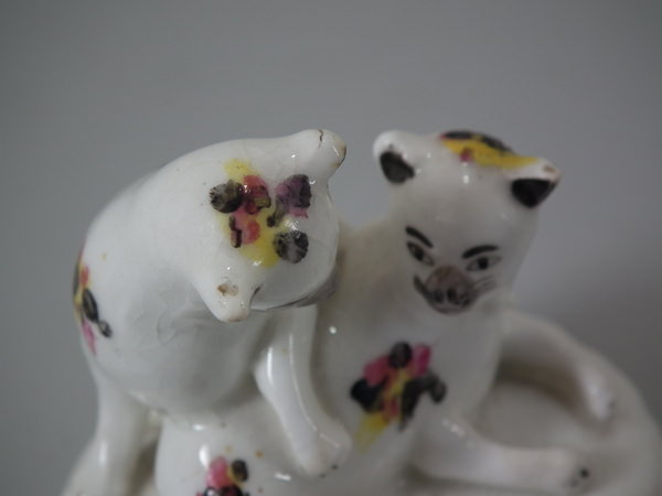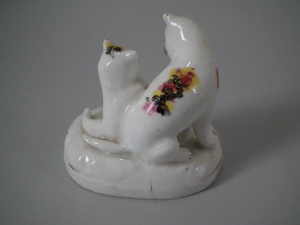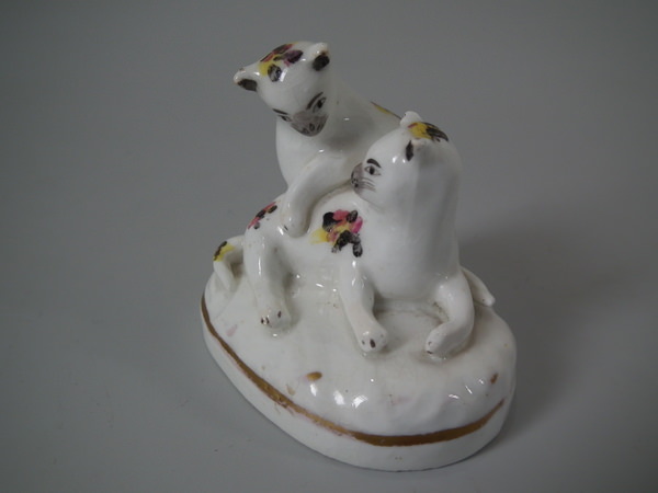 Victorian, circa 1850. 2.6ins high, 2.8ins wide, 2.1ins depth. Staffordshire porcellaneous group which features two cats, recumbent on an oval hollow base. Dull gilt base line.