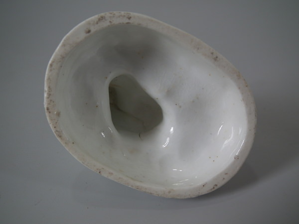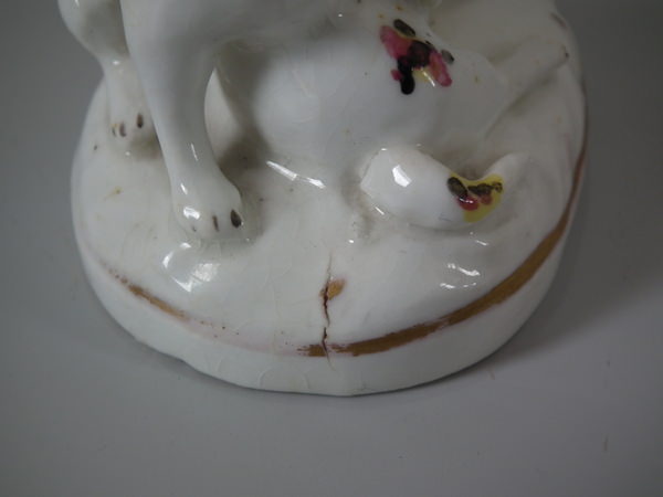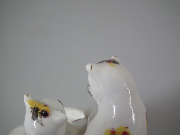 small piece of kiln detritus caught in the glaze behind tail of recumbent cat.