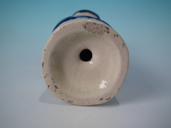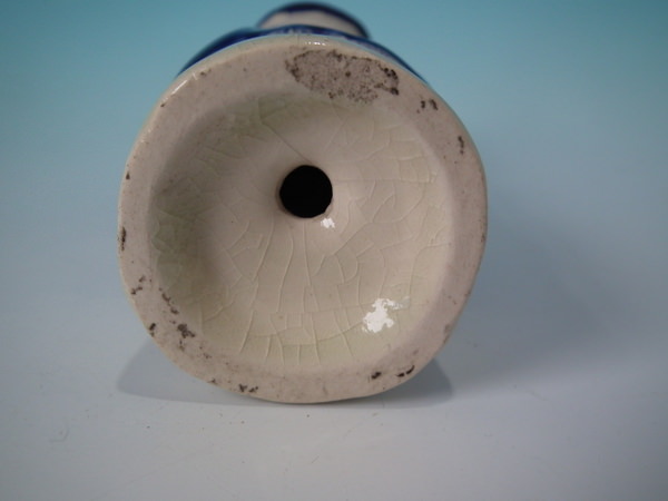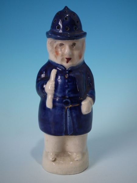 Victorian, circa 1880. 6.3ins high, 2.6ins wide, 2.4ins depth. Staffordshire pepper pot which features a policeman, stood on a circular base. Multi-coloured with underglaze blue version. Bright gilt embellishment.