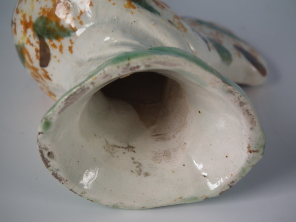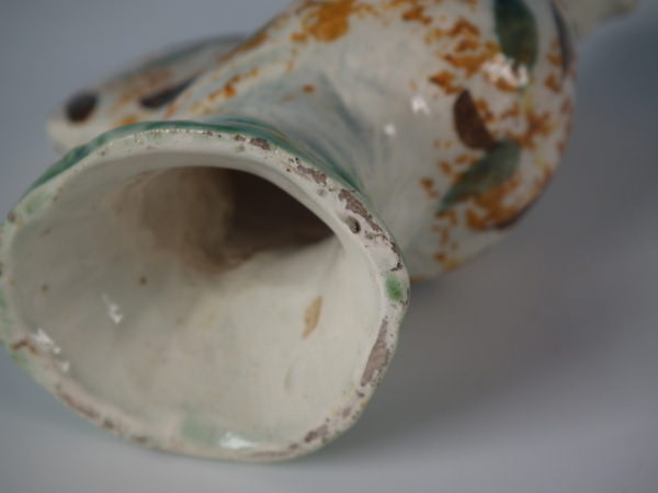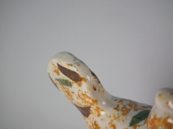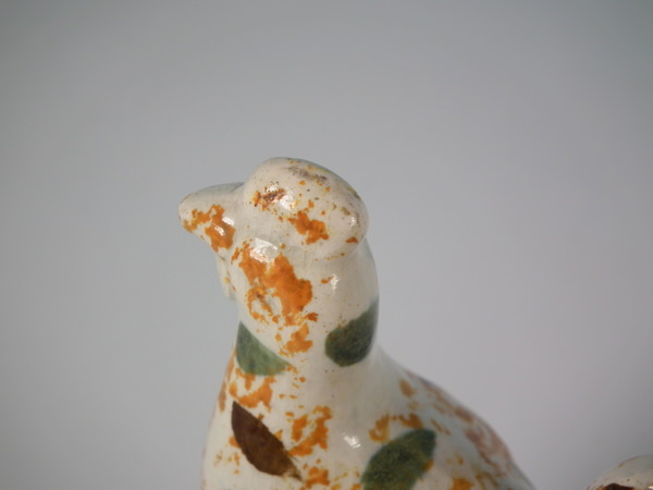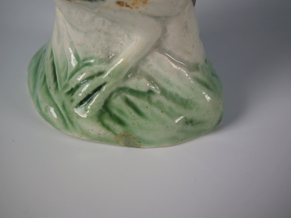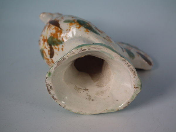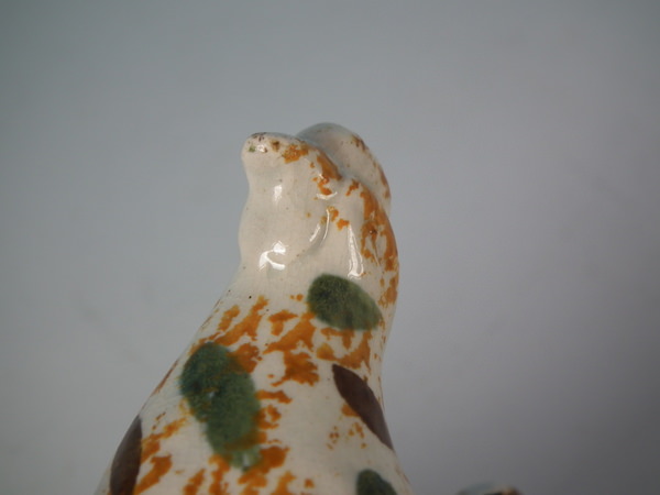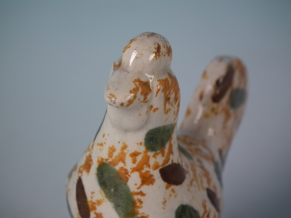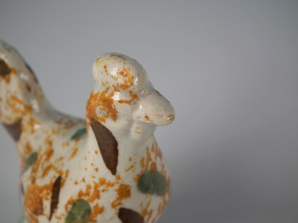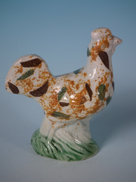 pre-Victorian, circa 1800. 3.3ins high, 2.8ins wide, 1.6ins depth. Staffordshire Prattware figure which features a cockerel, stood on a shaped base.