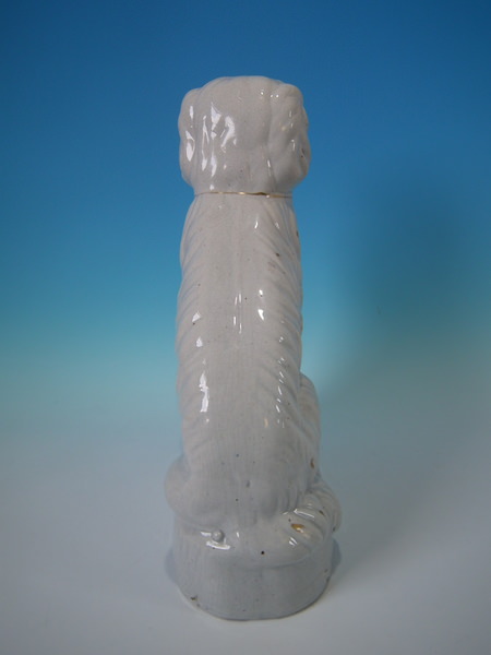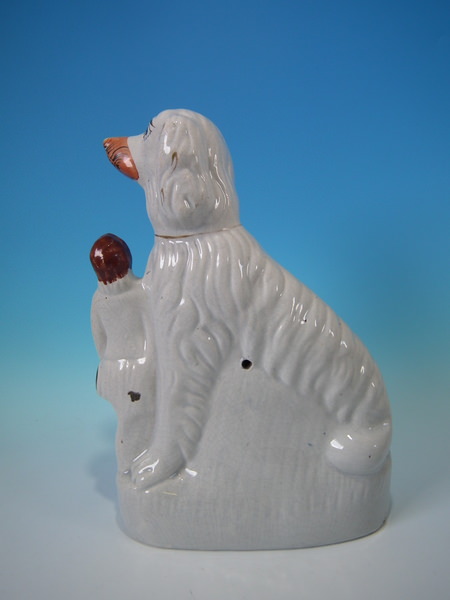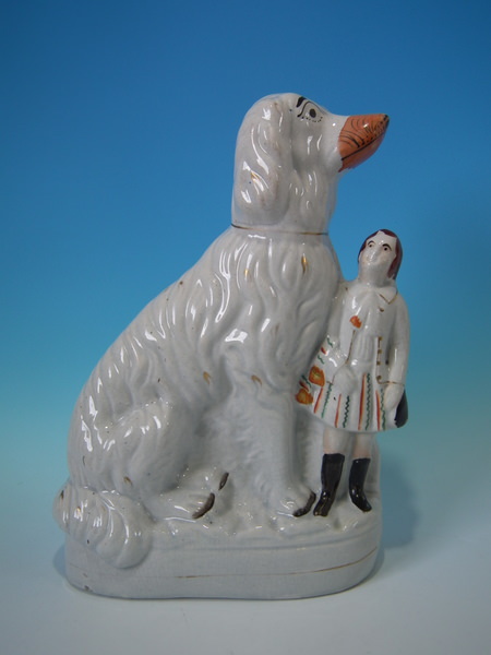 Victorian, circa 1860. 12.6ins high, 9.4ins wide, 4.5ins depth. Staffordshire figure which features a boy standing beside an oversized Afghan hound, seated on an oblong base.