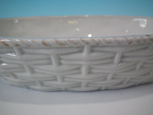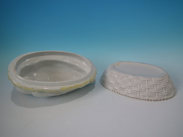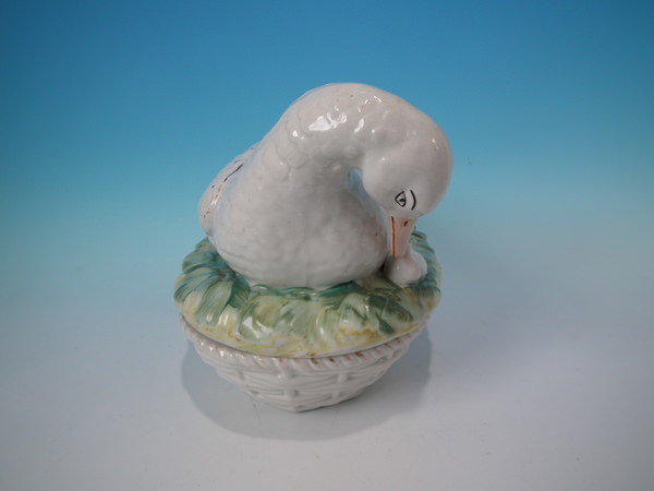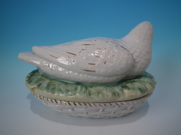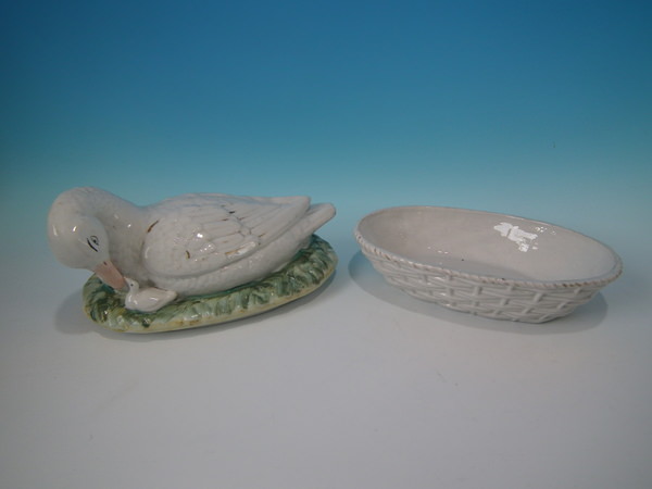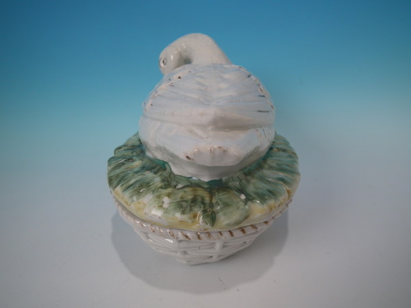 Victorian, circa 1860. 6.3ins high, 9.4ins wide, 5.9ins depth. Staffordshire egg tureen and cover which features a duck and her duckling, resting on a basketweave oval base.