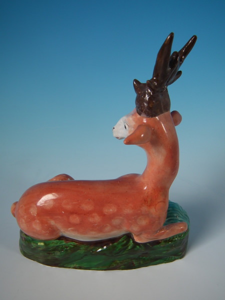 pre-Victorian, circa 1820. 6.9ins high, 6.1ins wide, 3ins depth. Staffordshire pearlware figure which features a recumbent stag, seated on an oval base.