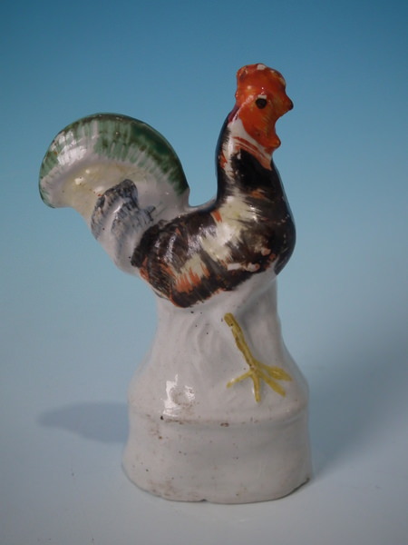 Victorian, circa 1850. 3.9ins high, 2.4ins wide, 1.3ins depth. Staffordshire figure with a pastoral theme which features a cockerel/rooster, stood on an oval base. Multi-coloured version.