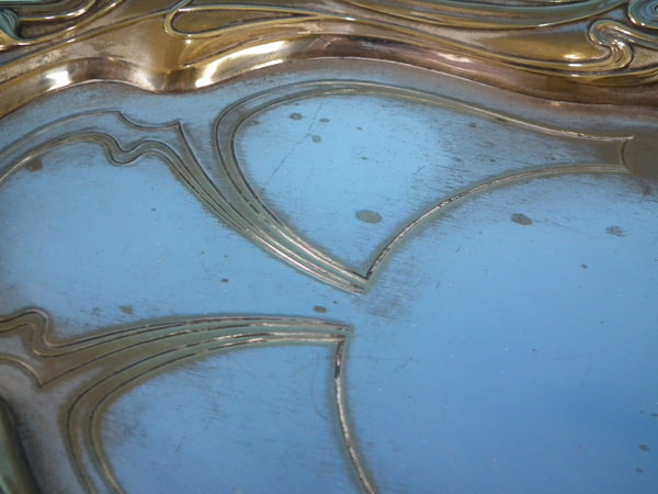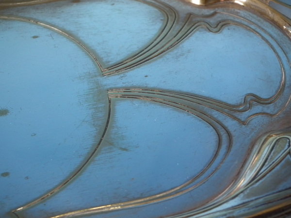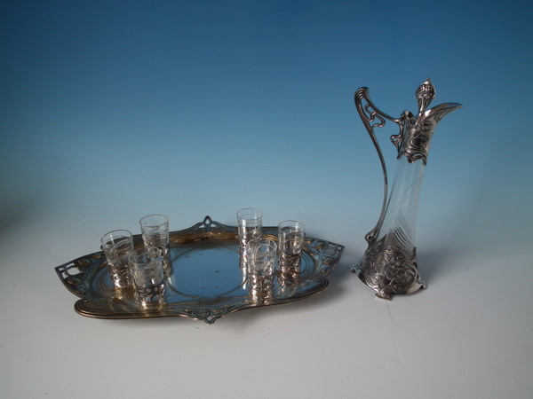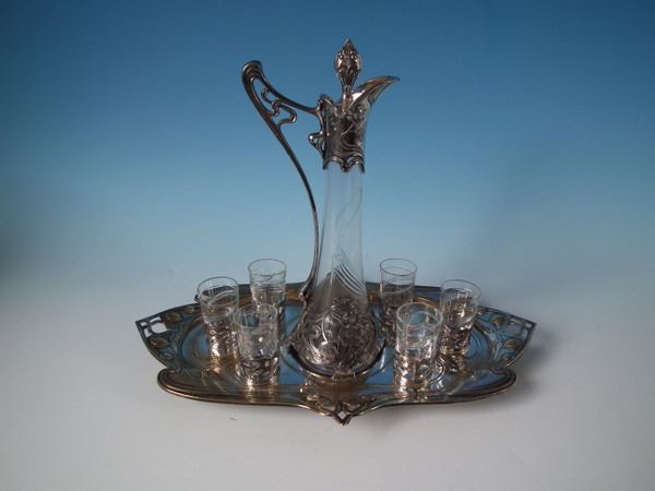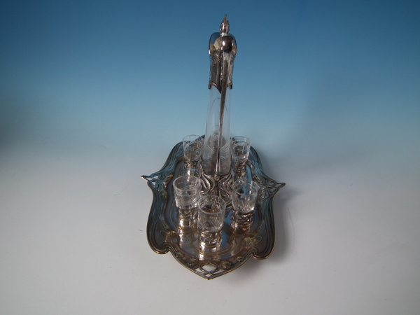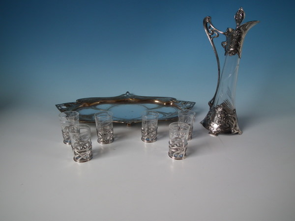 Circa 1910. 10ins by 13.5ins wide. WMF Art Nouveau liqueur decanter, cut crystal glasses and tray.