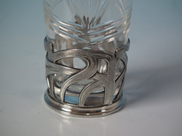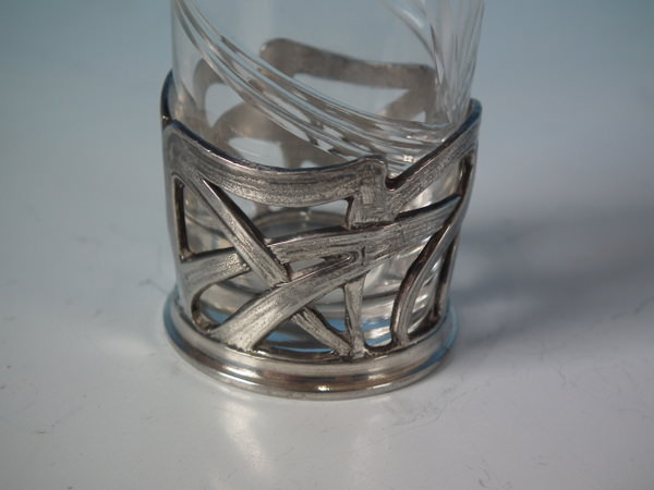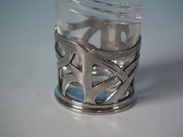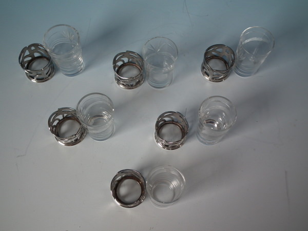 Clear, cut crystal liner. 6 clear cut crystal glasses, in silver plated holders.