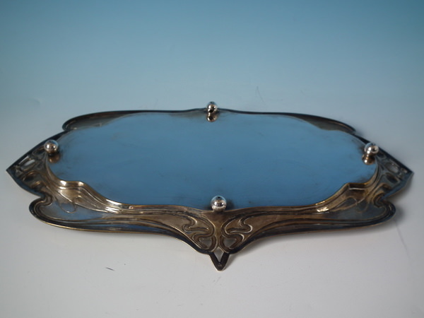 Silver plated tray with pierced rim. Four ball feet to underside.