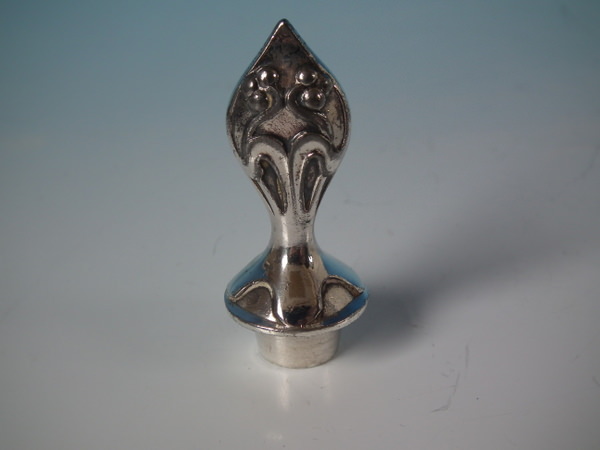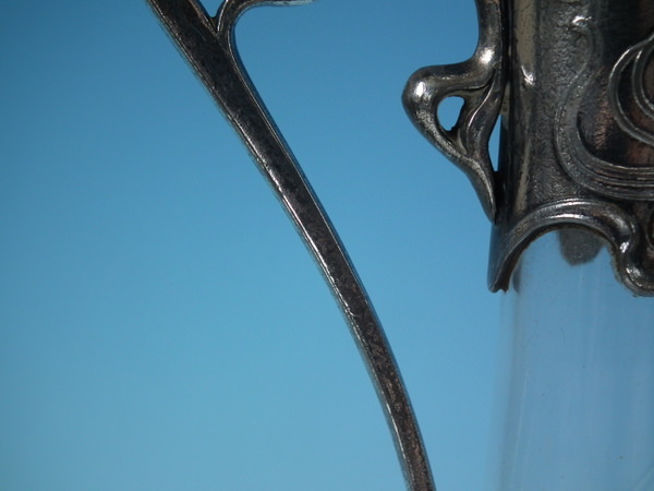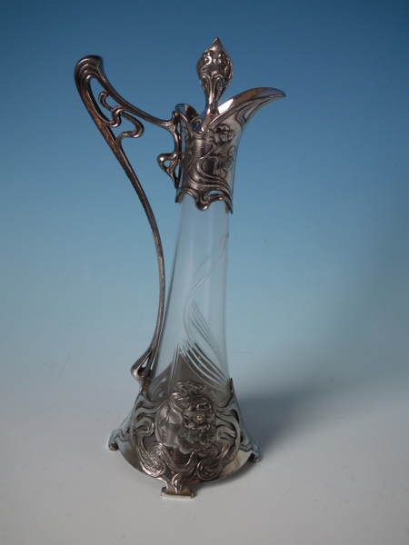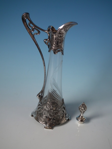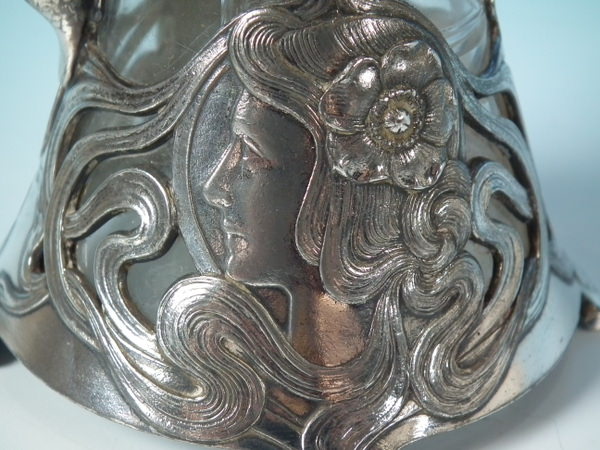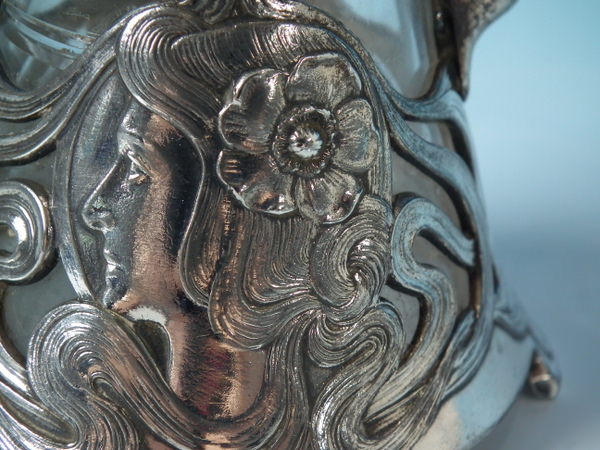 Deacanter with pierced, silver plated frame on four feet. Maiden's head on either side of the base, and stylized flowers in relief around the top. Scroll handle and removable stopper.
