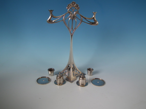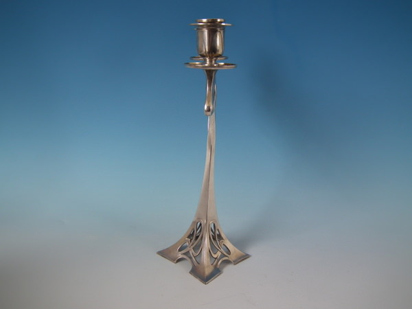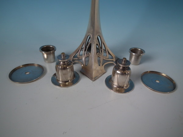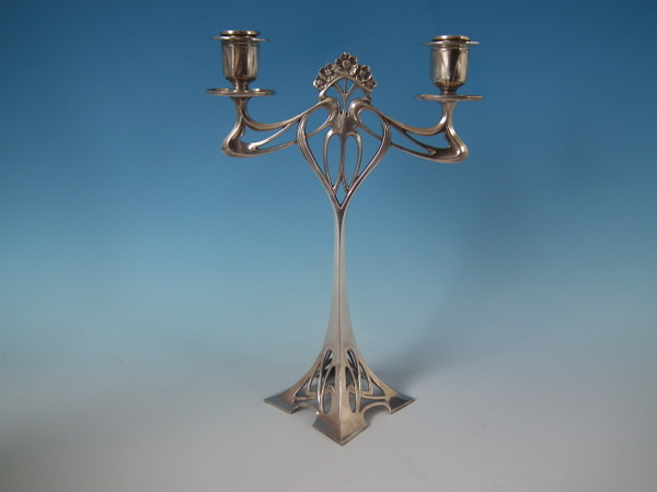 Circa 1910. 8.25ins by 12ins high. WMF silver plated twin branch candelabra on square pierced base.
