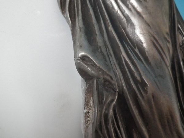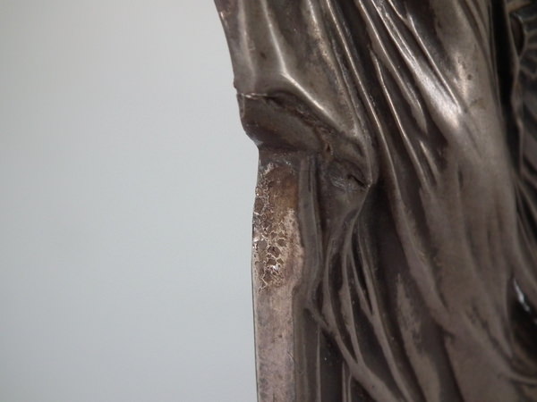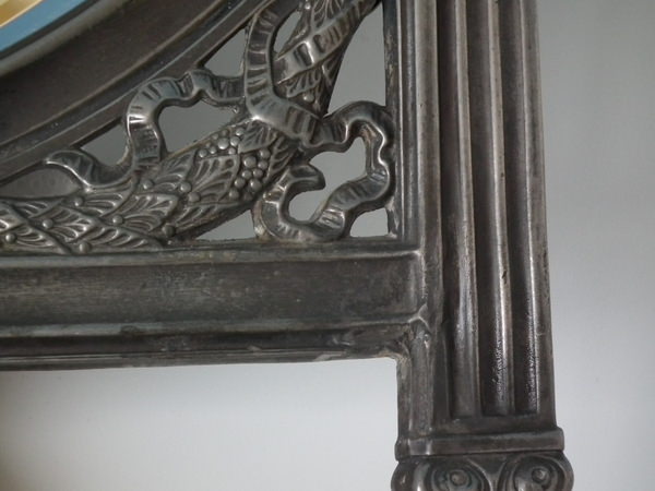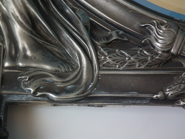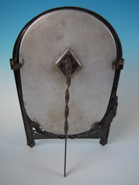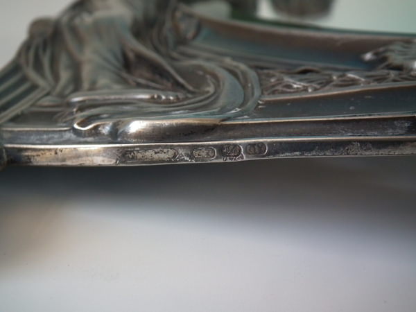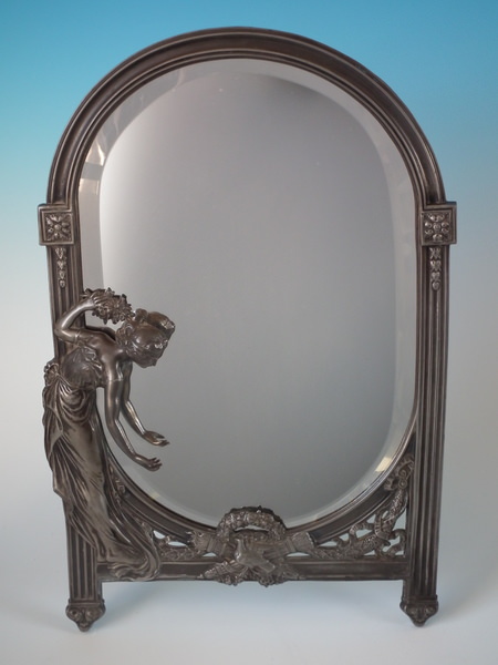 Circa 1910. 15.25ins by 10.25ins wide. WMF Art Nouveau table mirror. The frame has a maiden on the left holding out her hand to a dove perched below her. Original bevelled glass and twisted rod support to the reverse.