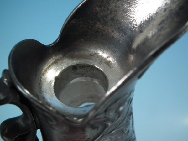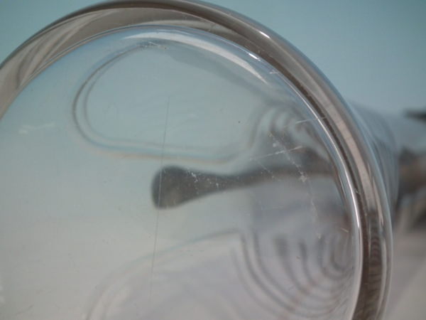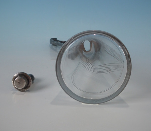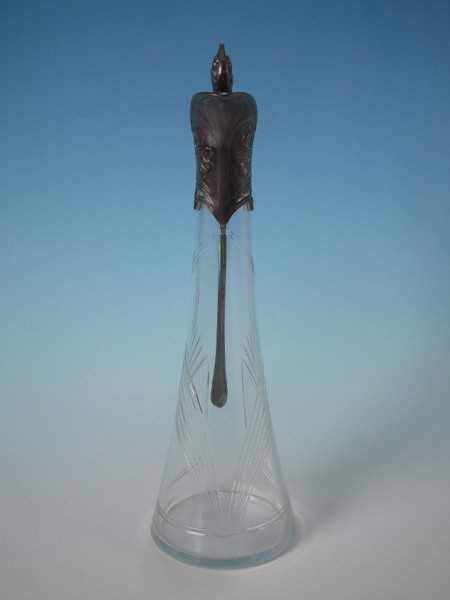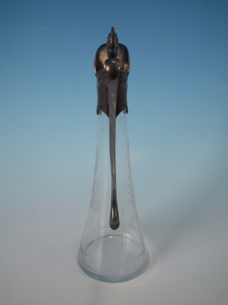 Circa 1910. 10.5ins high. WMF glass liqueur jug with pierced handle and neck. Removable stopper.