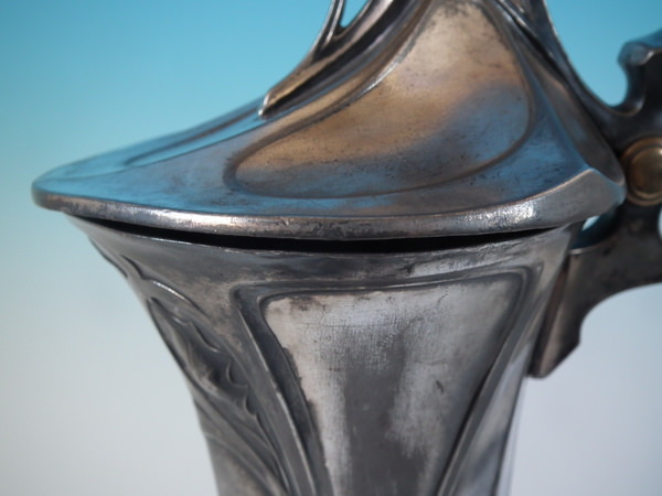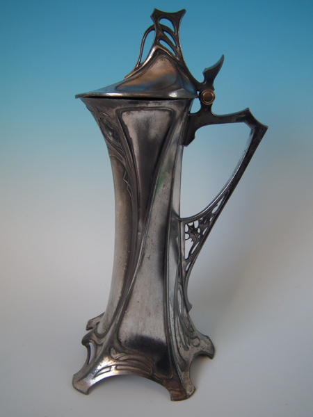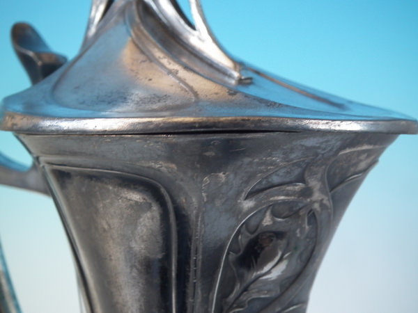 Circa 1910. 14.25ins high by 6ins wide. WMF claret jug/pitcher in the Art Nouveau style, with holy decoration to the spout and handle. Handle, thumb piece and flip lid.