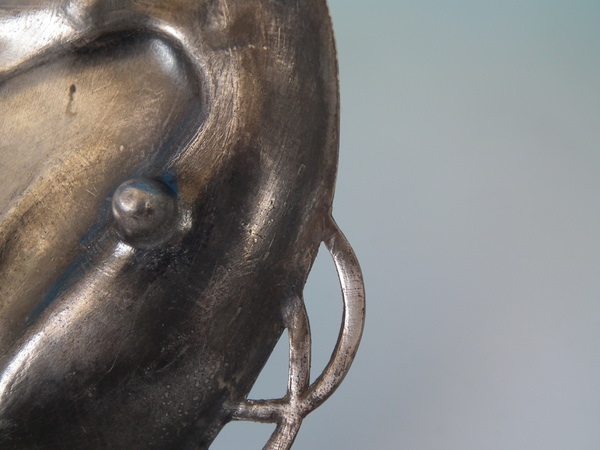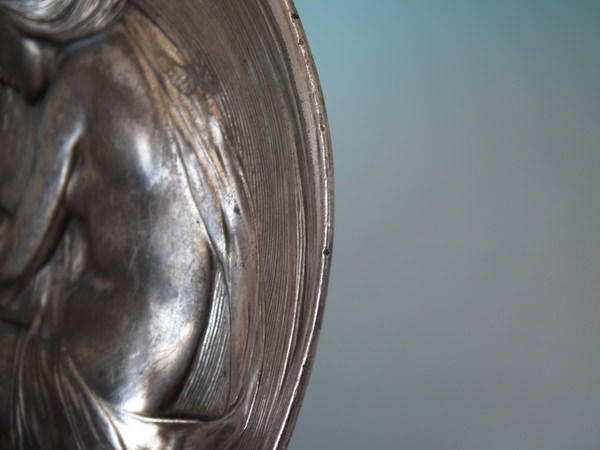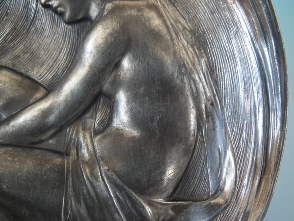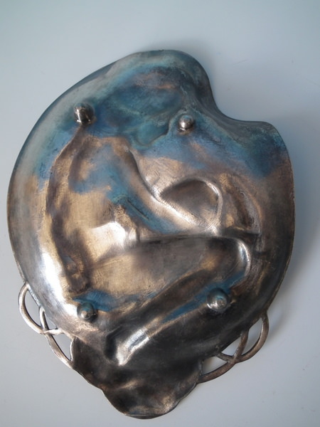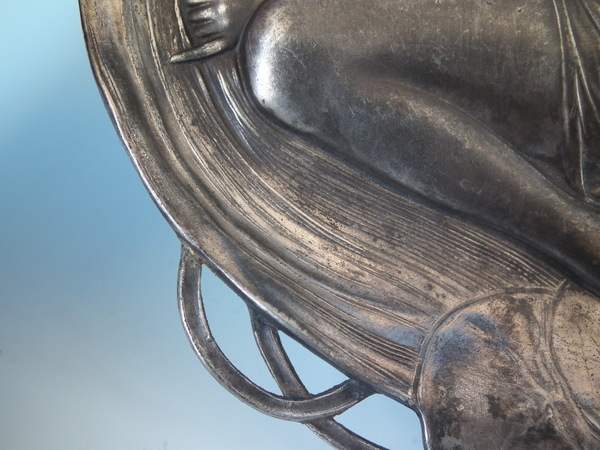 Circa 1910. 6.25ins by 4.75ins wide. WMF jewel tray decorated in relief with a maiden sitting on three lily pad leaves, her long flowing hair surrounds her.