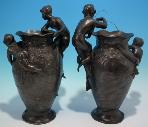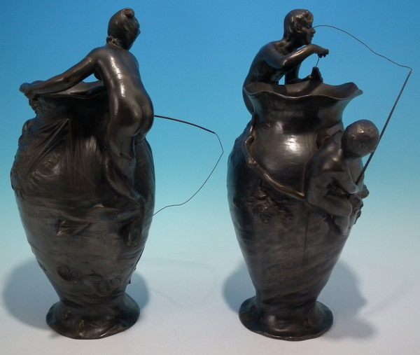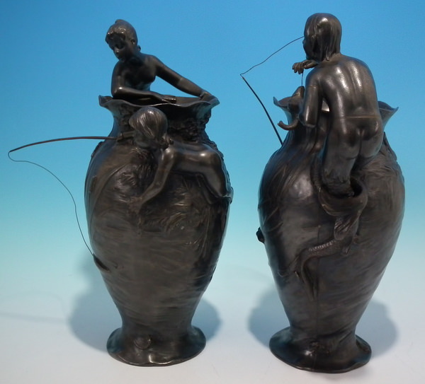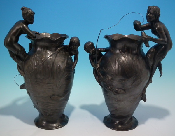 Circa 1905. 29cm high, 20cm wide. Pair WMF flower vases decorated with a mermaid and merman each with a child fishing.