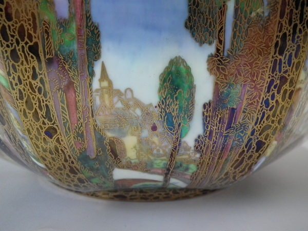 Circa 1920. 11.25ins diameter 5.5ins high. Wedgwood Fairyland lustre octagonal bowl decorated in Dana, 'castle on a road' design,