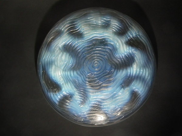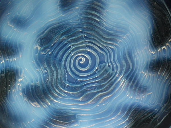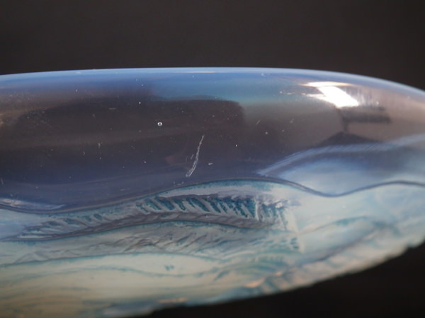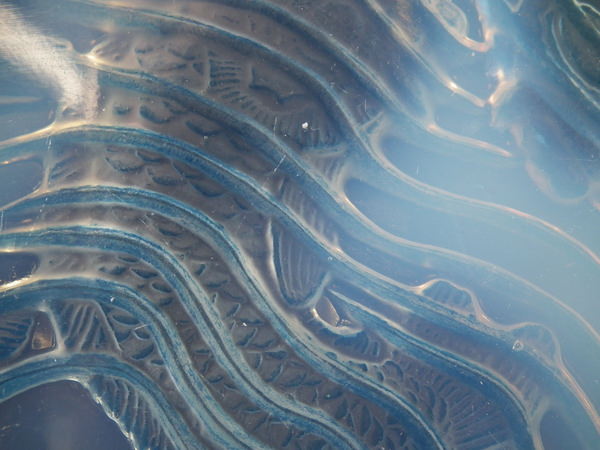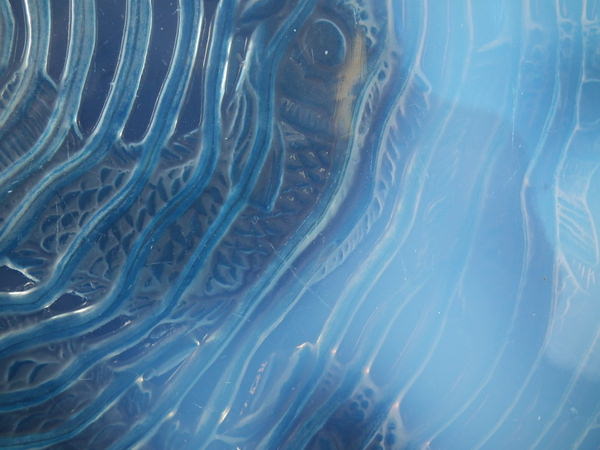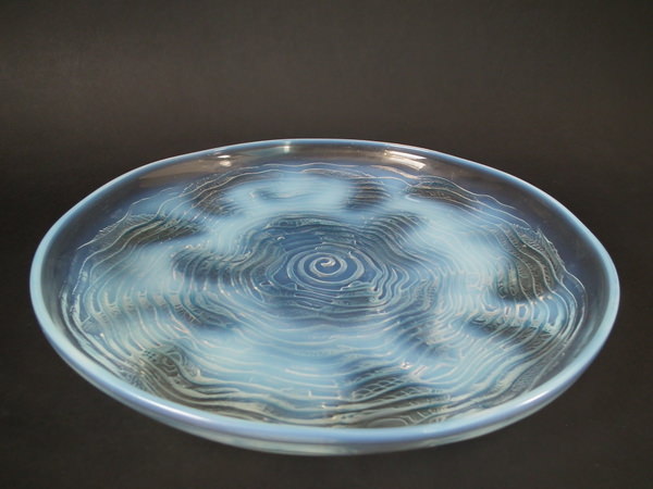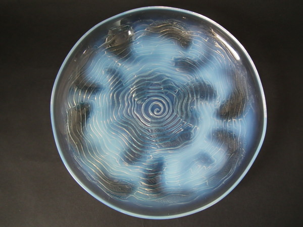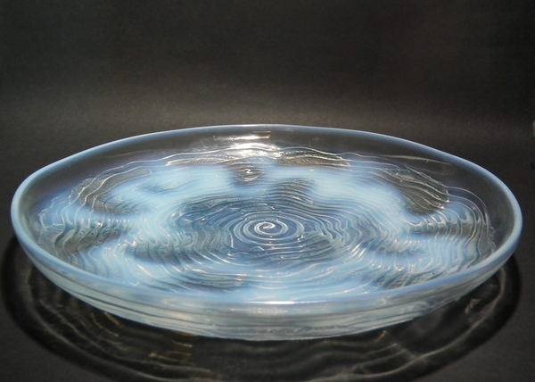 Introduced in 1932. Height: 4cm (1.57ins). Width: 29cm (11.4ins). Depth: 29cm (11.4ins). René Lalique Opalescent Glass, blue stained 'Dauphins' Coupe plate.