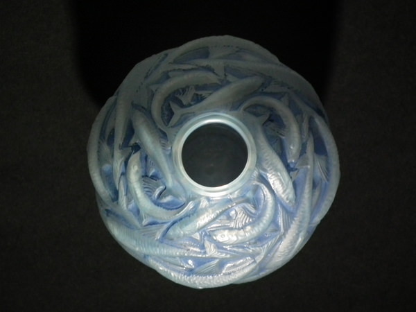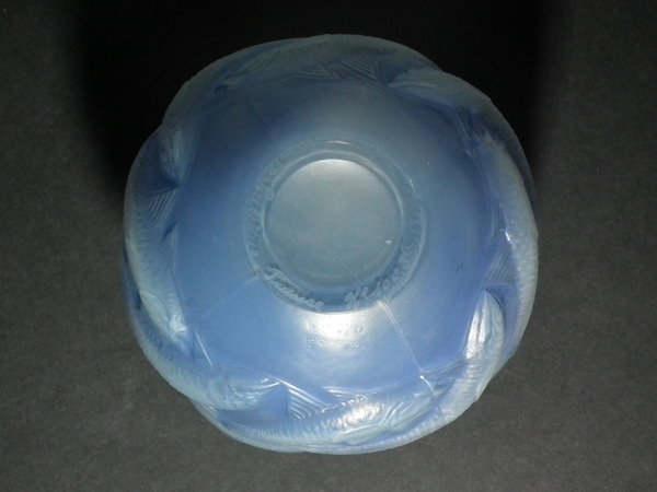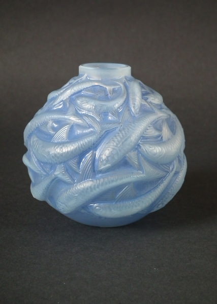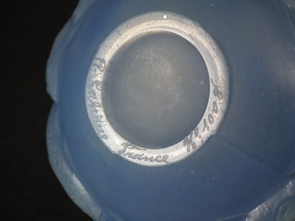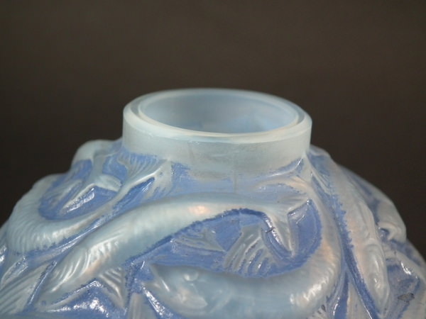 Introduced in 1927. Height: 9cm (3.54ins). Width: 9.5cm (3.74ins). Depth: 9.5cm (3.74ins). René Lalique Opalescent with blue staining Glass 'Oleron' vase.