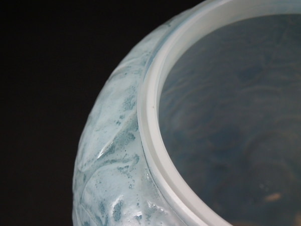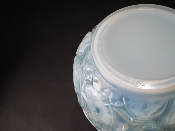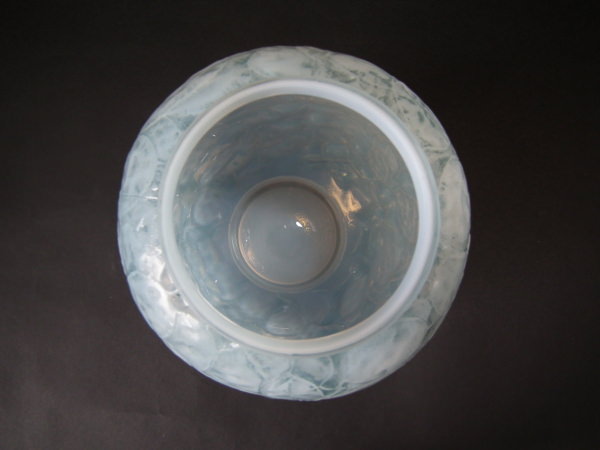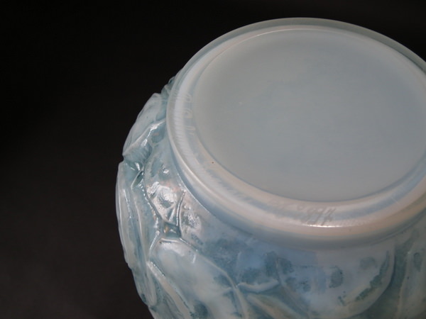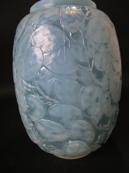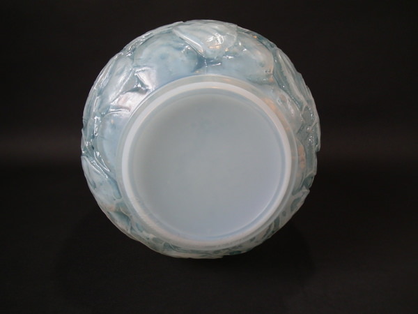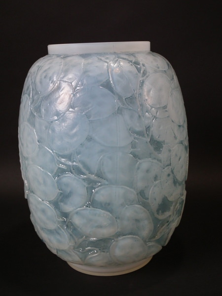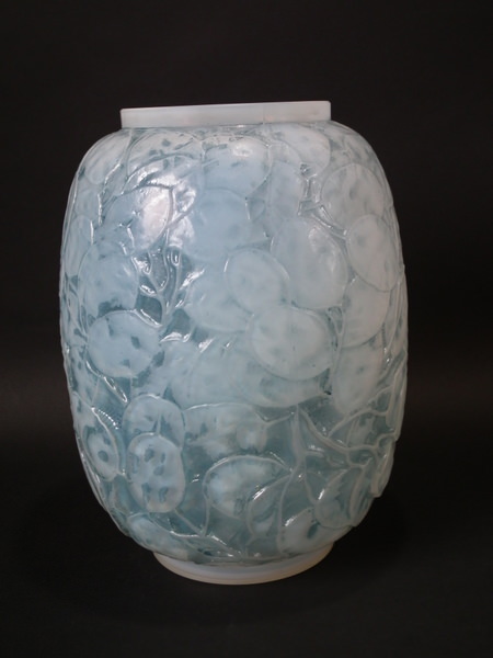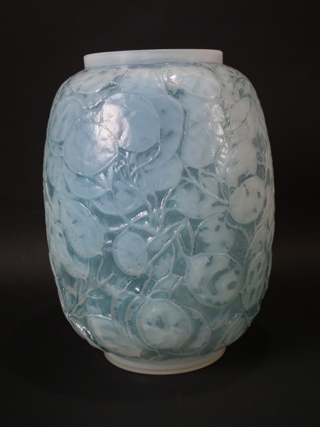 Introduced in 1928. Height: 23.6cm (9.29ins). Width: 18cm (7.09ins). Depth: 18cm (7.09ins). René Lalique Oplalescent with blue staining Glass 'Monnaie Du Pape' Vase.