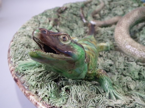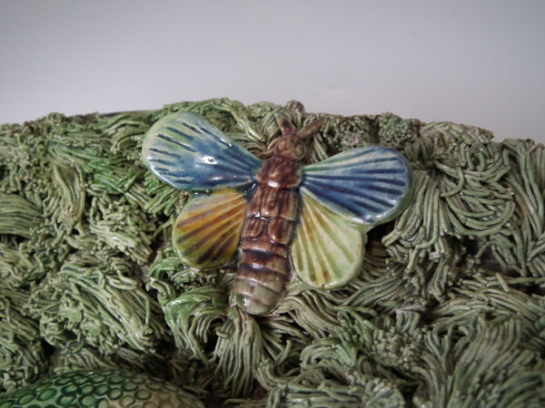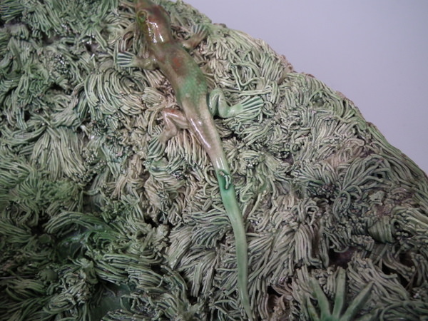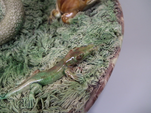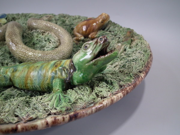 Victorian, circa 1890. 15.7ins high, 15.7ins wide, 5.5ins depth. Mafra Portuguese Palissy Majolica wall charger which features a snake, lizards, toad and a moth.