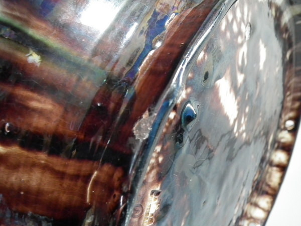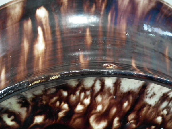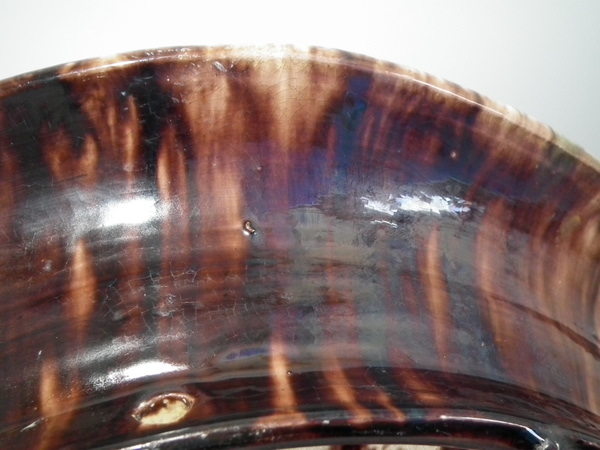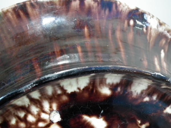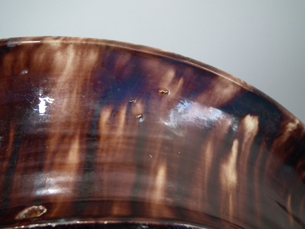 a few specks of kiln detritus caught in the glaze to the lizards and underside.