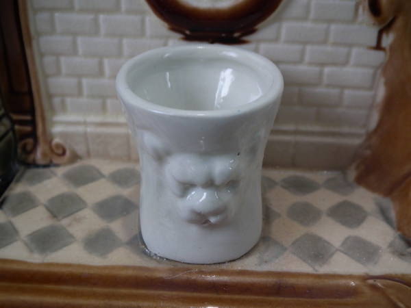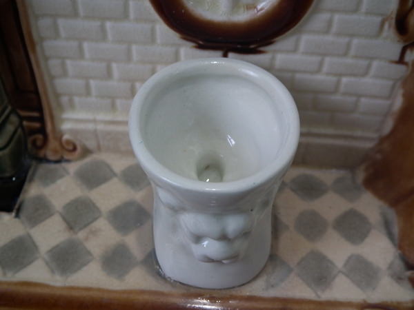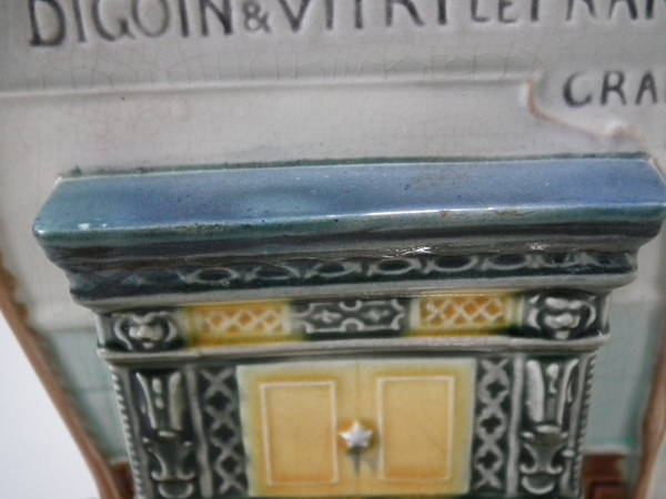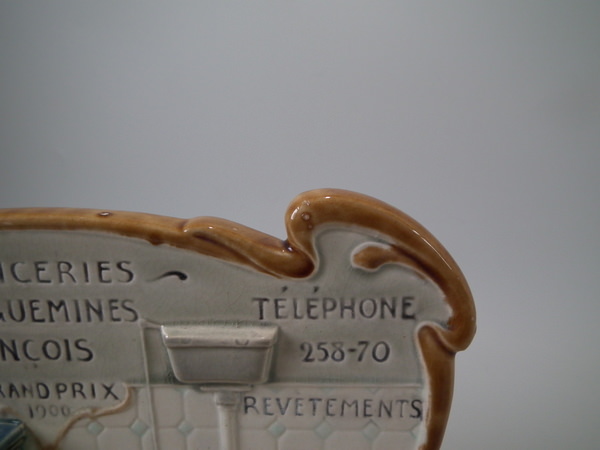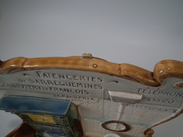 Victorian, circa 1900. 7.3ins high, 10.4ins wide, 6ins depth. Sarreguemines Majolica advertising sign which features a bathroom, with a toilet and a heating system.