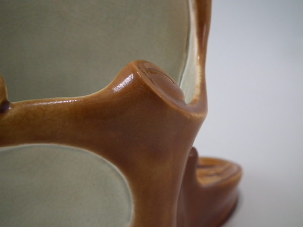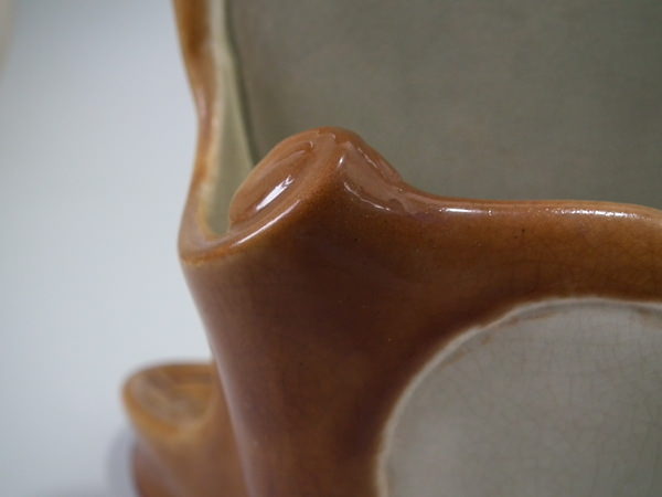 CONDITION: Generally good. KILN EFFECTS: glaze pops to the brown edge at the top and to the front of the base.
