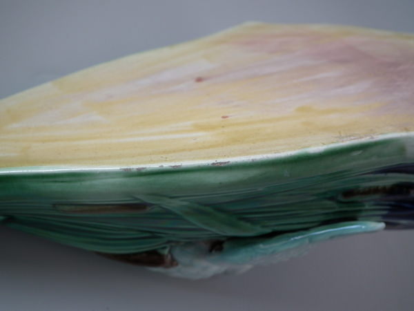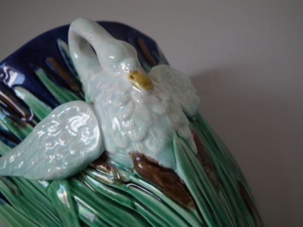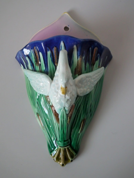 Victorian, circa 1880. 10ins high, 6.3ins wide, 3.9ins depth. Majolica wall pocket which features a swan amongst cattails/bulrushes.
